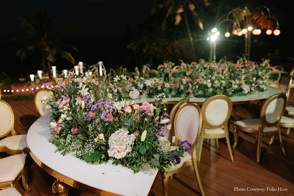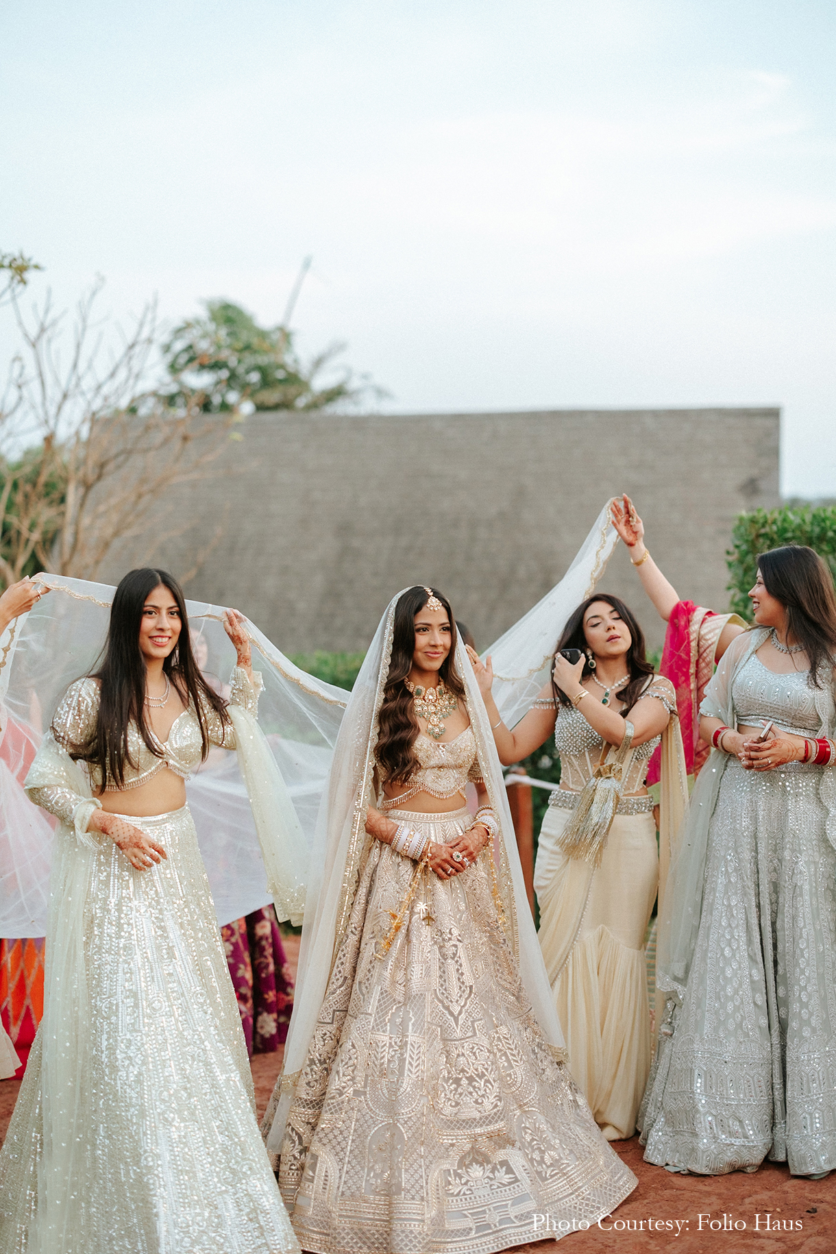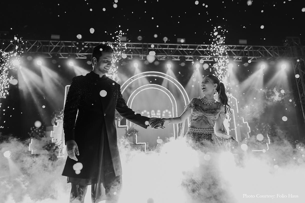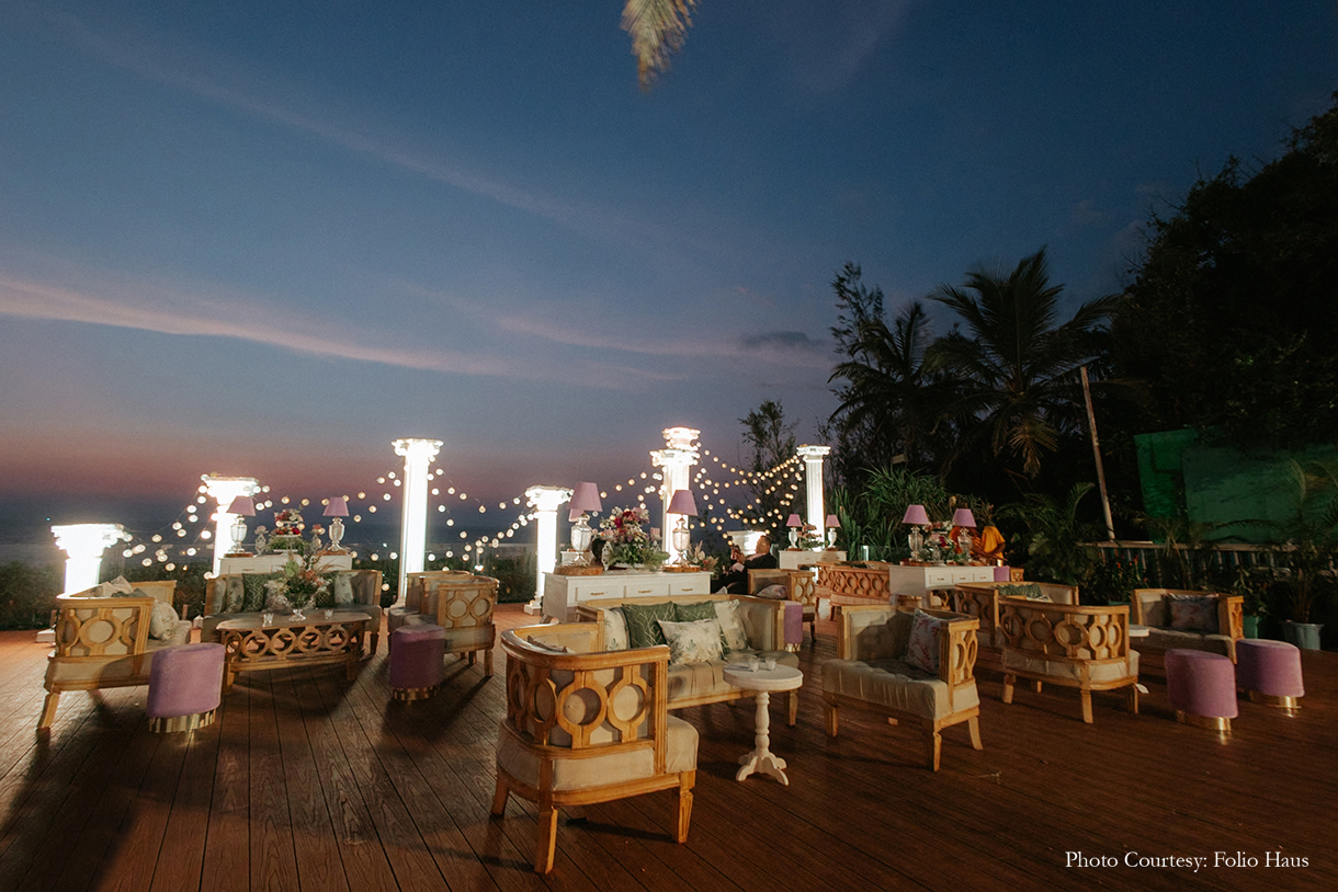 The sundowner sangeet was a glamorous one hosted at the Seaview lawns. The guests were treated to a view of a starlit night sky, a colossal stage and gold fairylights that were suspended over the seating area. Fog and bubbles gave the couple a mysterious entry while a photobooth ensured the guests took plenty of polaroids home. The night transitioned into a groovy after-party after a set of high-octane family dance performances.