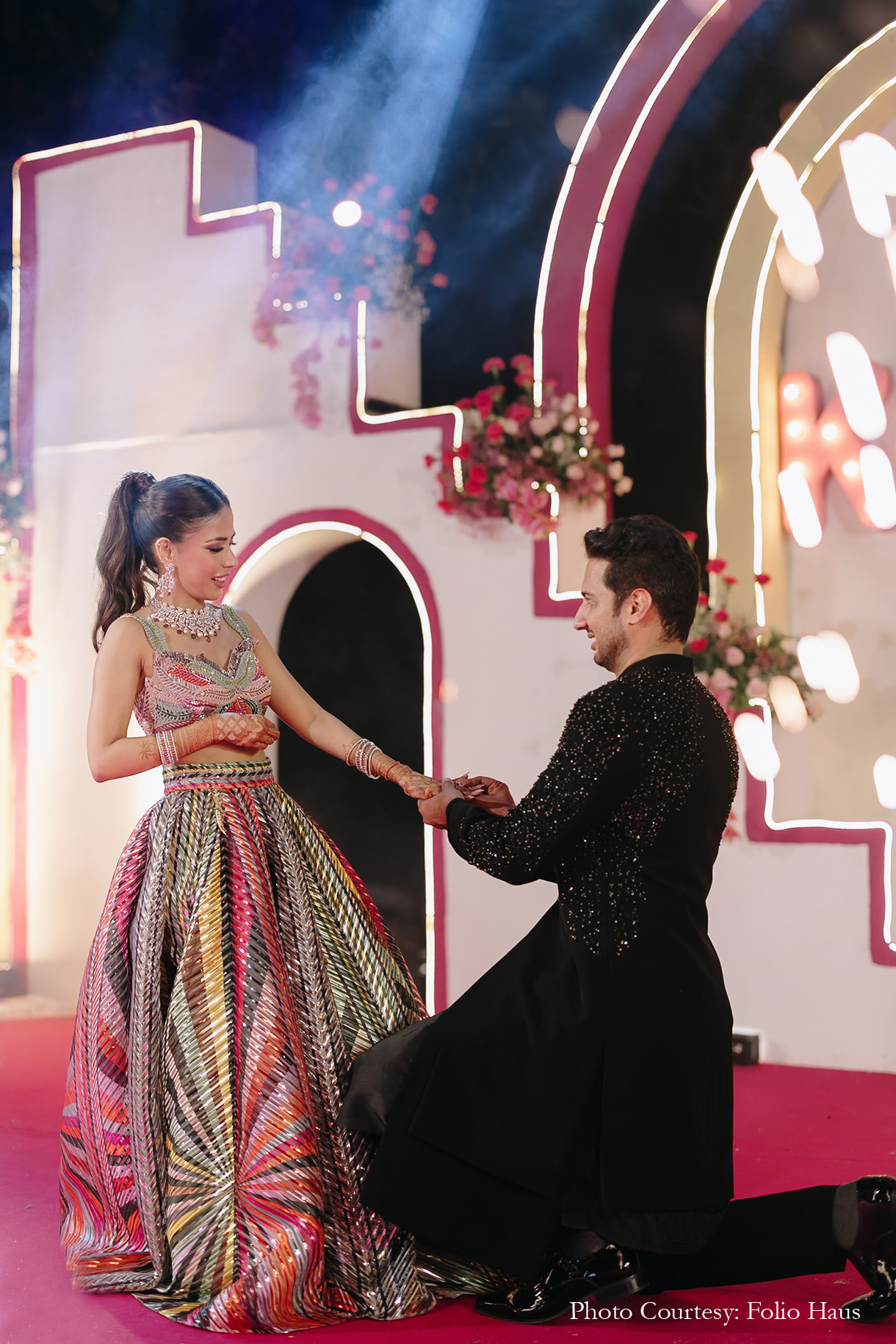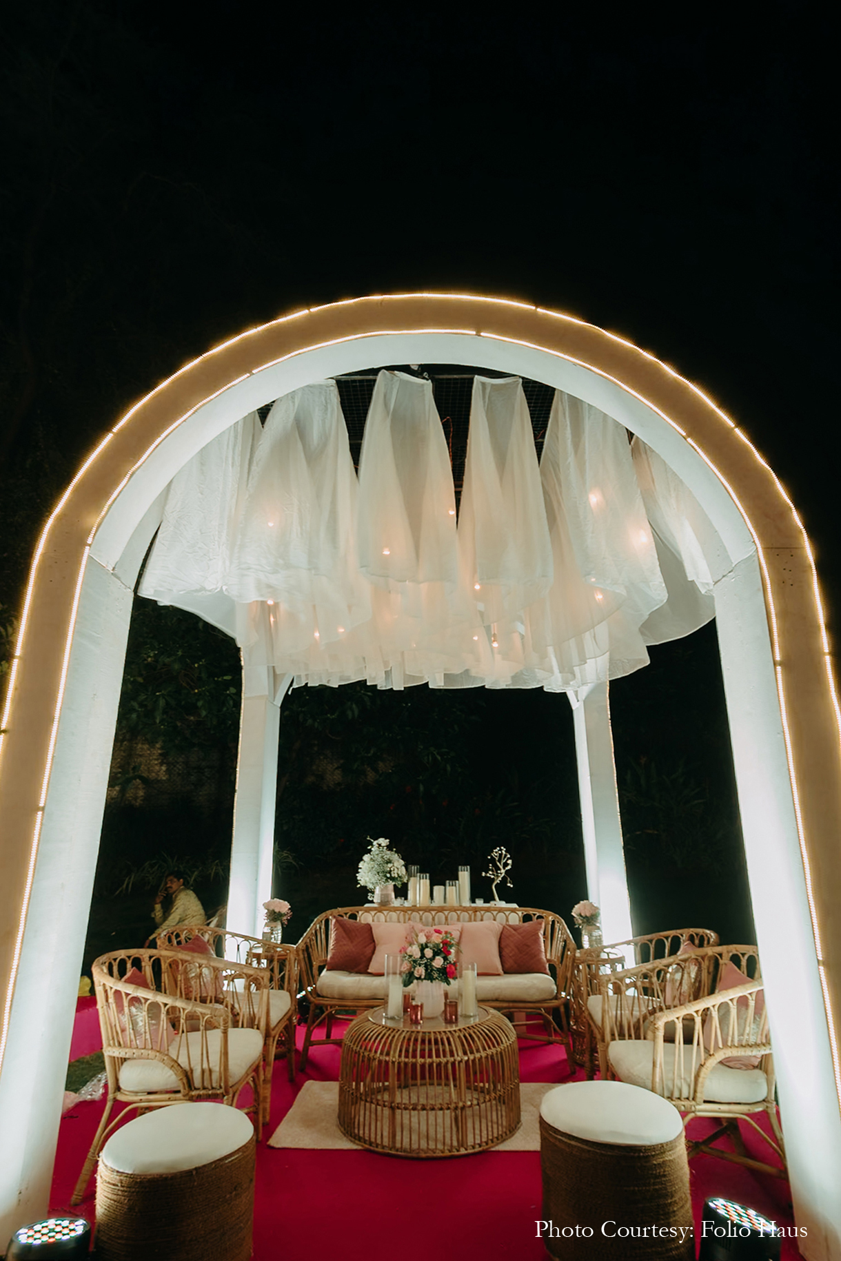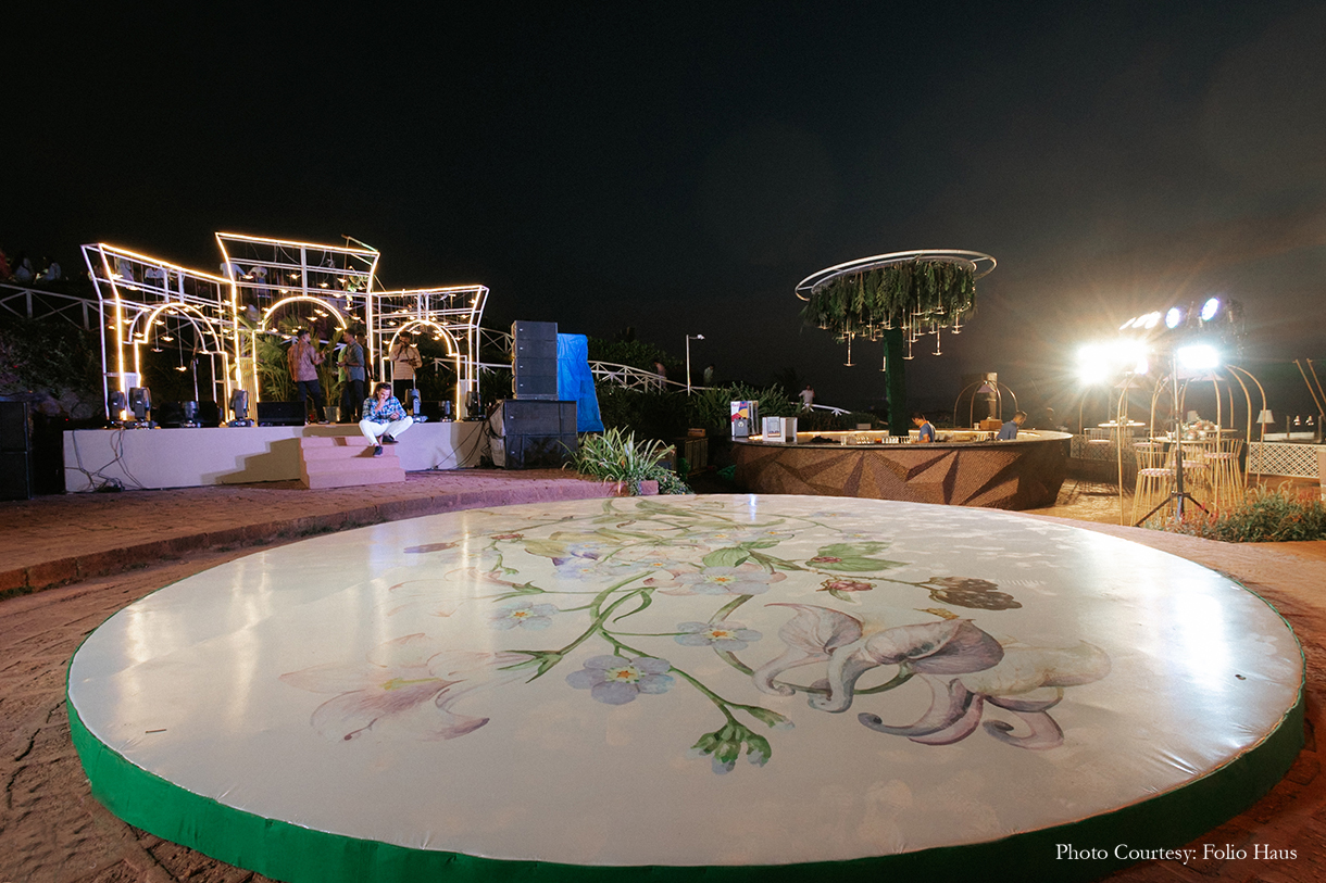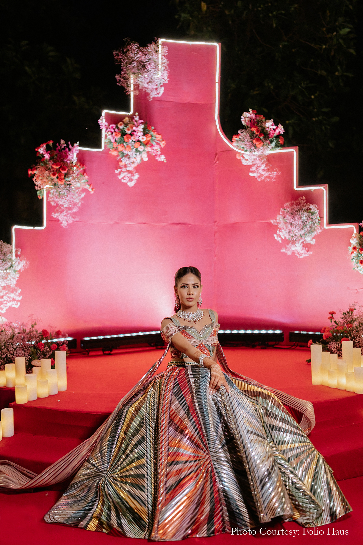 The sundowner sangeet was a glamorous one hosted at the Seaview lawns. The guests were treated to a view of a starlit night sky, a colossal stage and gold fairylights that were suspended over the seating area. Fog and bubbles gave the couple a mysterious entry while a photobooth ensured the guests took plenty of polaroids home. The night transitioned into a groovy after-party after a set of high-octane family dance performances.