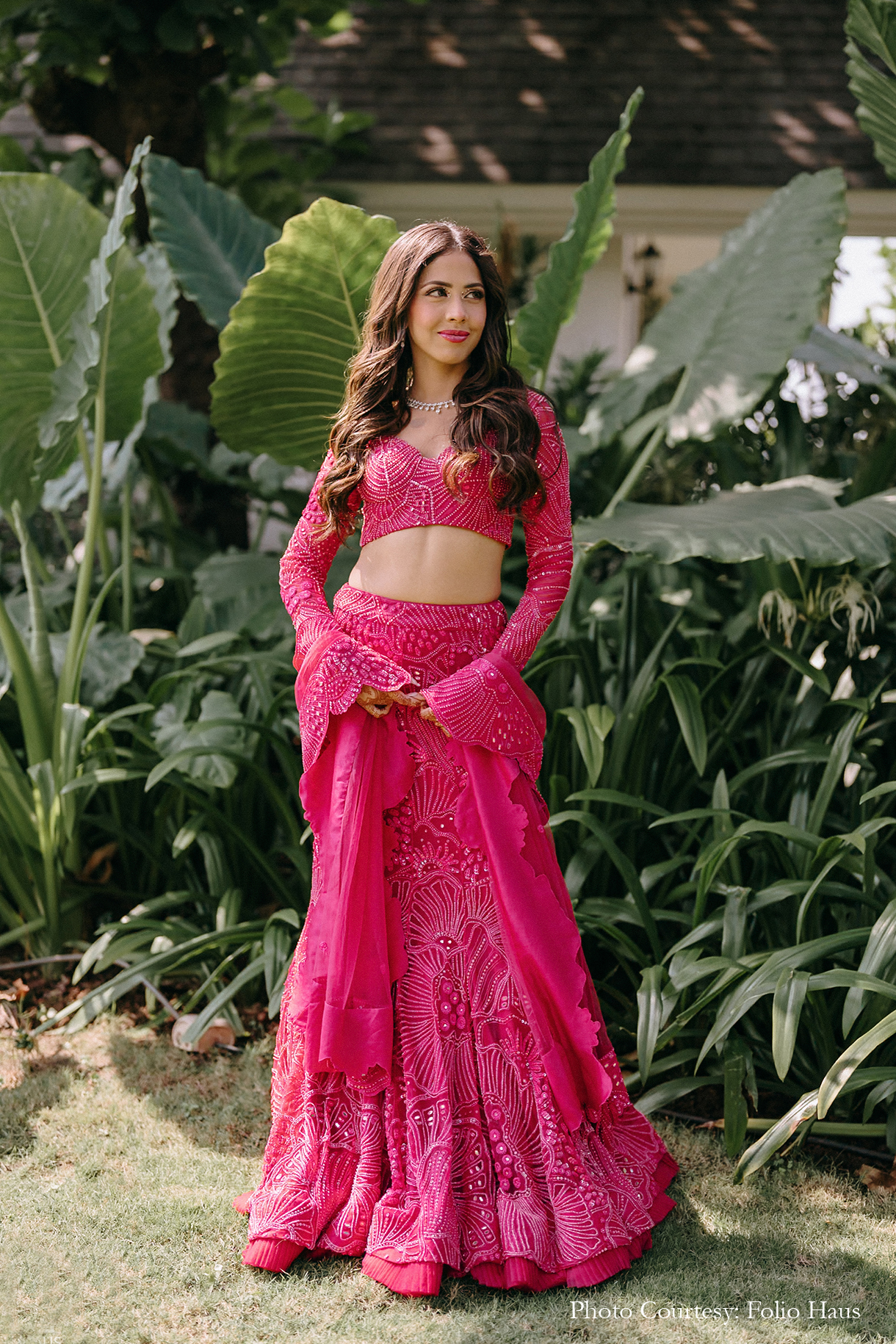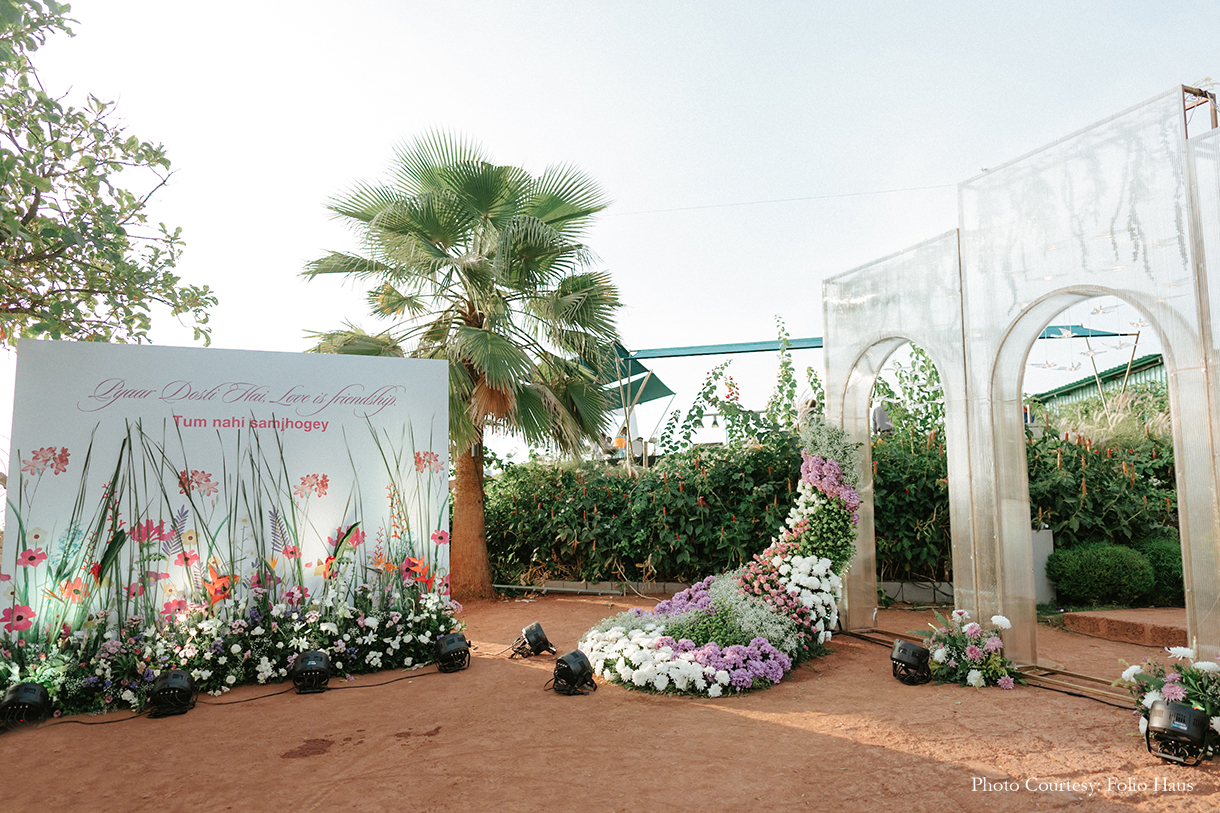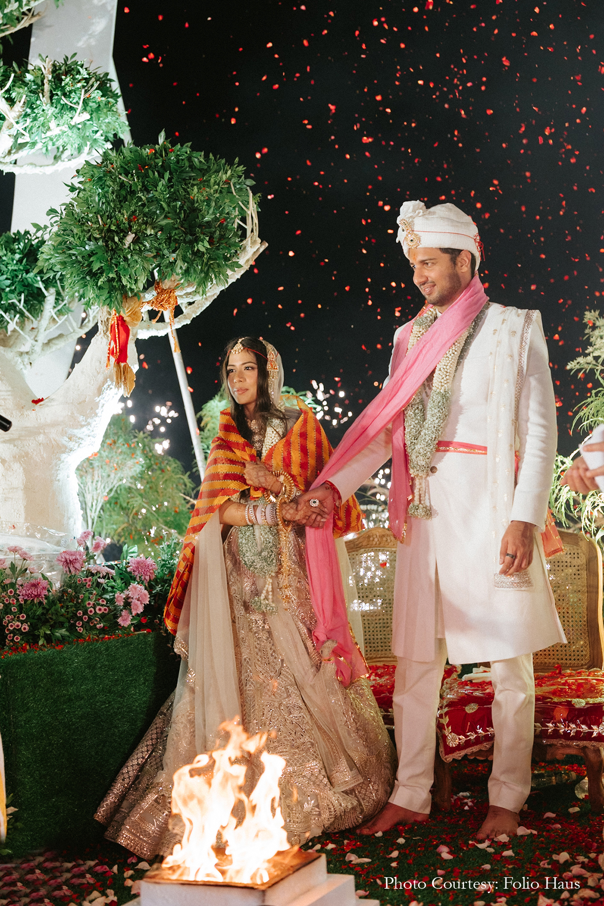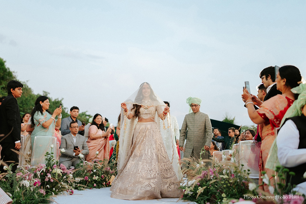 The sundowner sangeet was a glamorous one hosted at the Seaview lawns. The guests were treated to a view of a starlit night sky, a colossal stage and gold fairylights that were suspended over the seating area. Fog and bubbles gave the couple a mysterious entry while a photobooth ensured the guests took plenty of polaroids home. The night transitioned into a groovy after-party after a set of high-octane family dance performances.