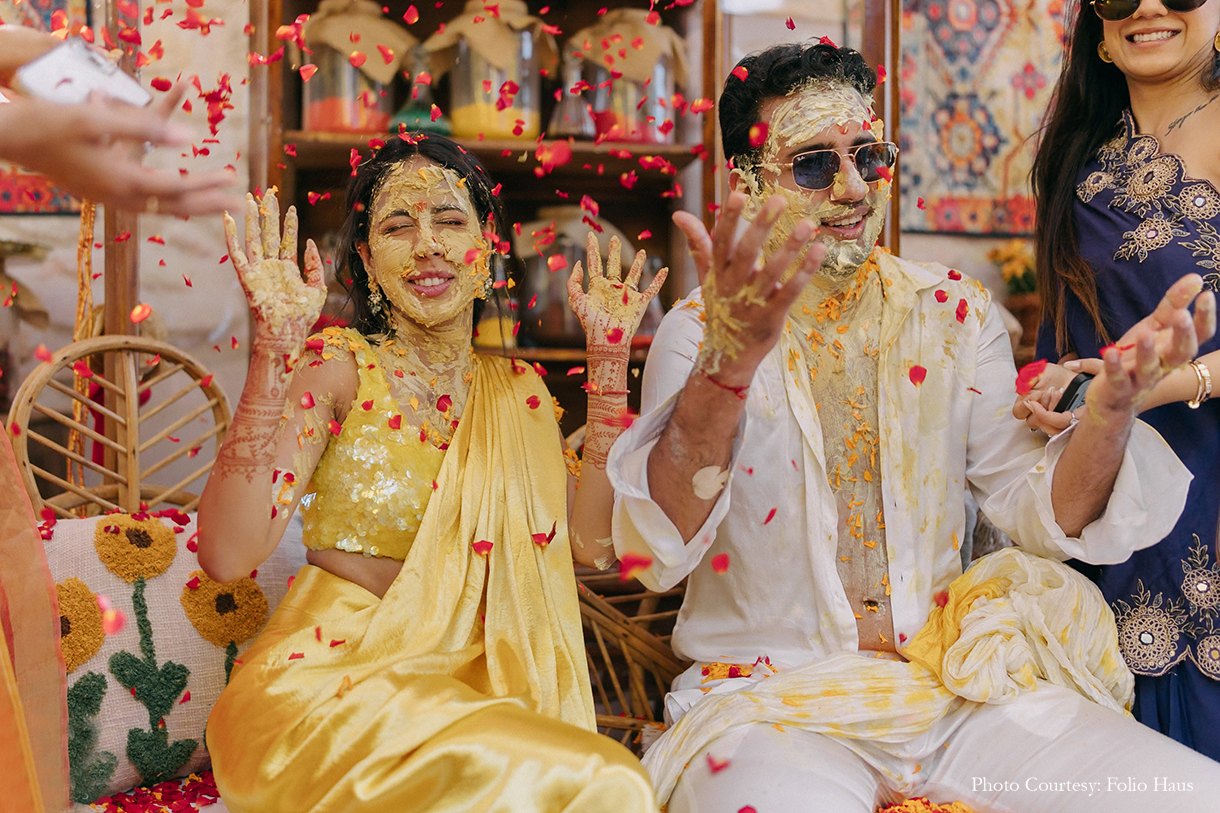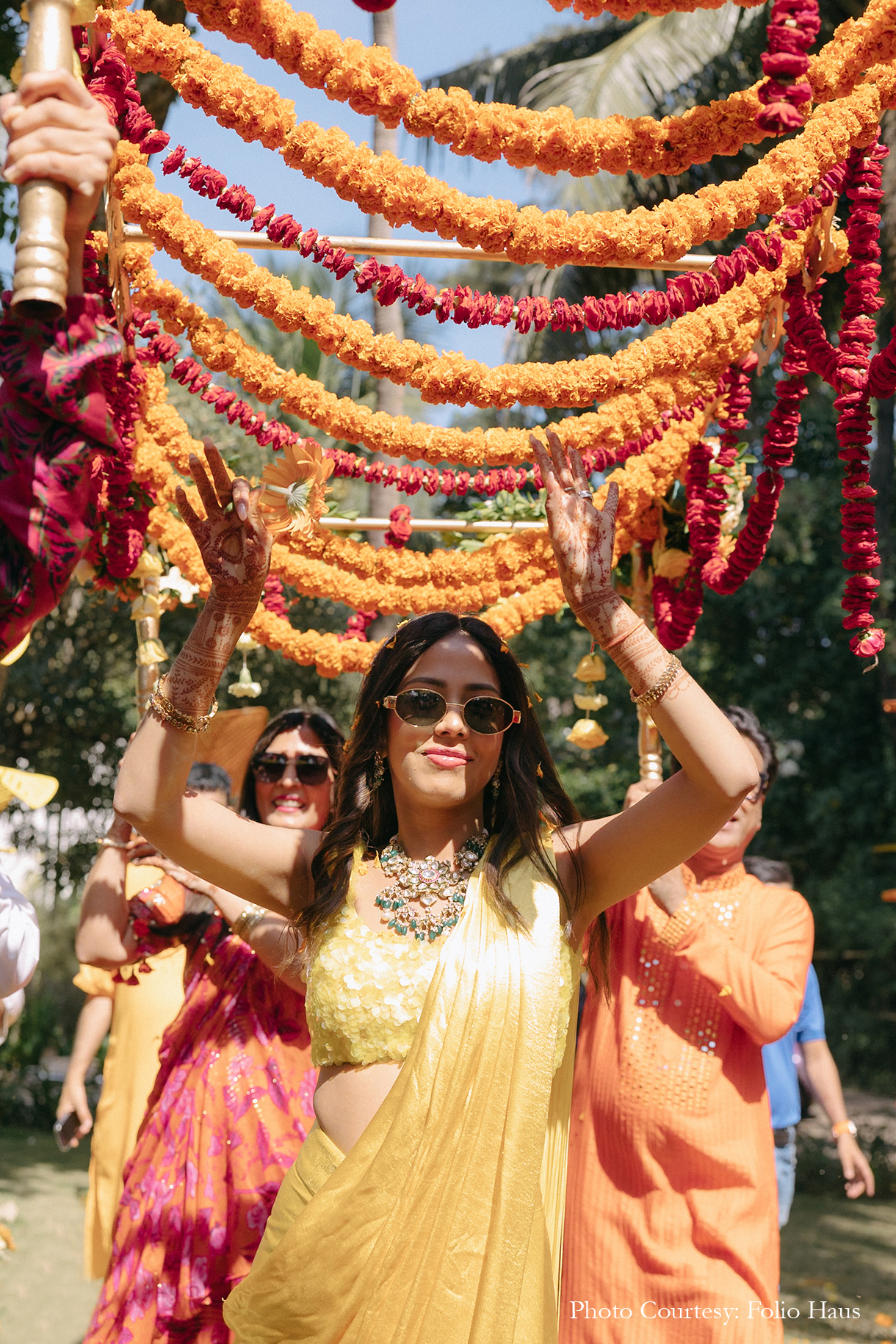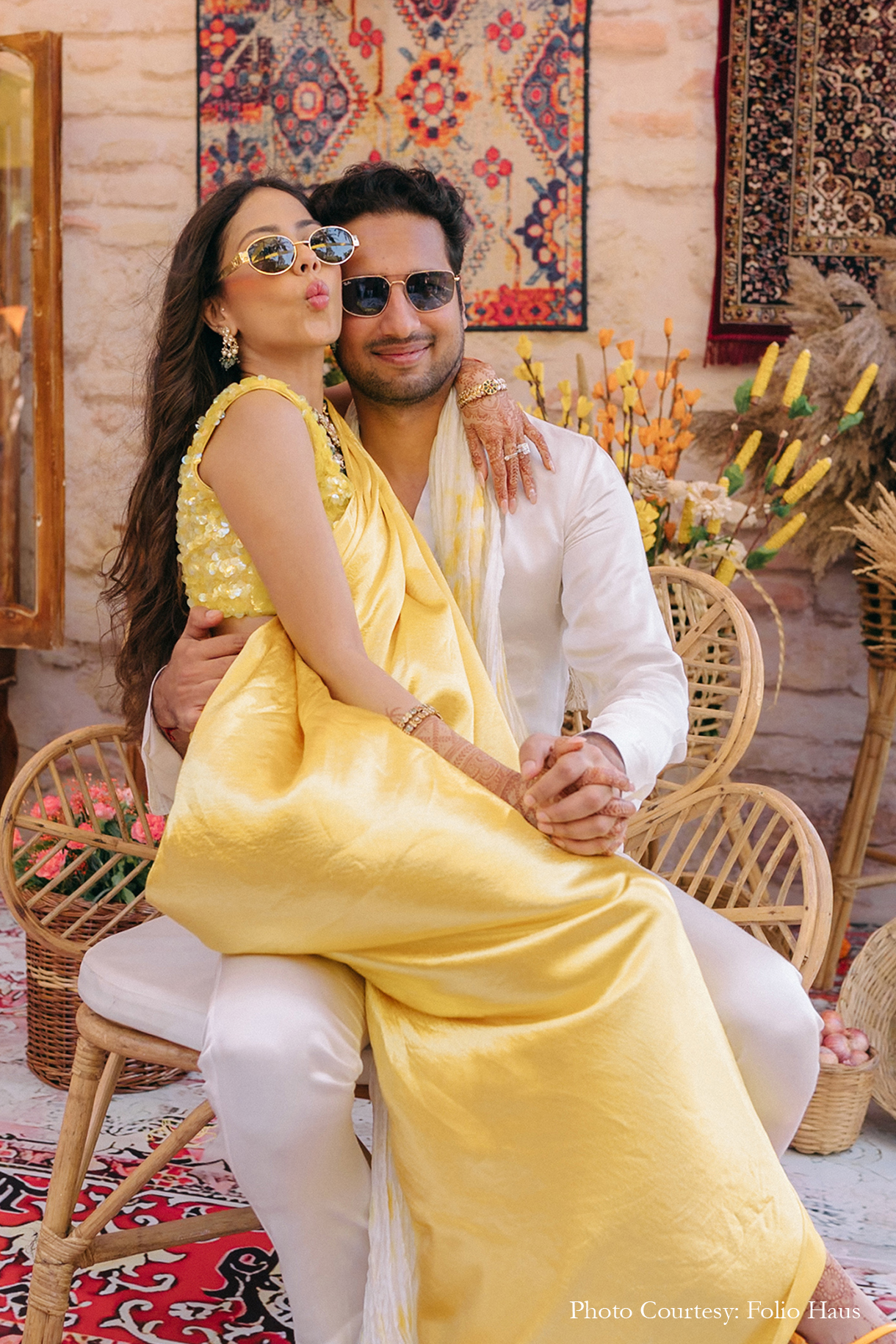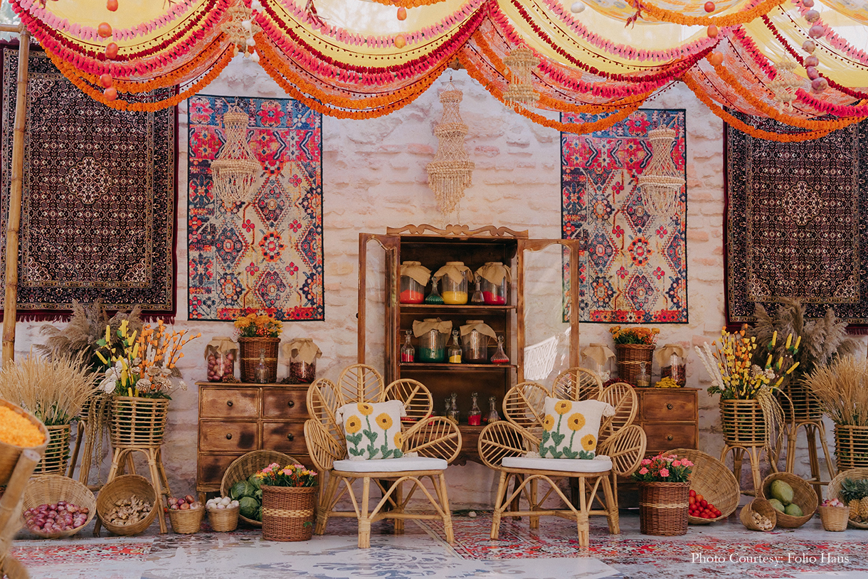 Devanshi shares, “The haldi followed a ‘Meena Bazaar’ theme. The venue was a garden-based one and once the guests entered, they were greeted by a sun-dappled lawn surrounded by blooms and a variety of stalls. Since the bride’s family is into export and import of gifting items, there were special gifting counters that offered personalised bags, clutches, diaries and much more.