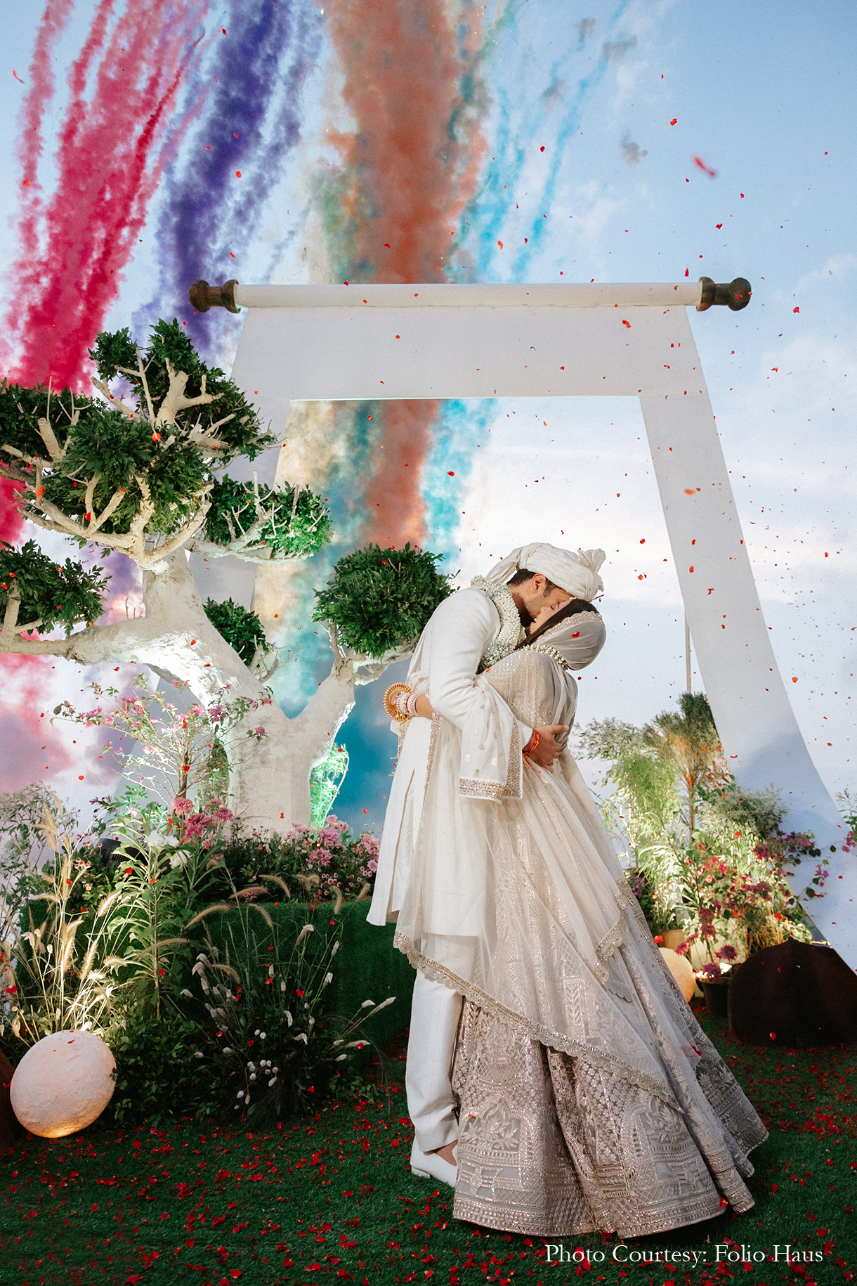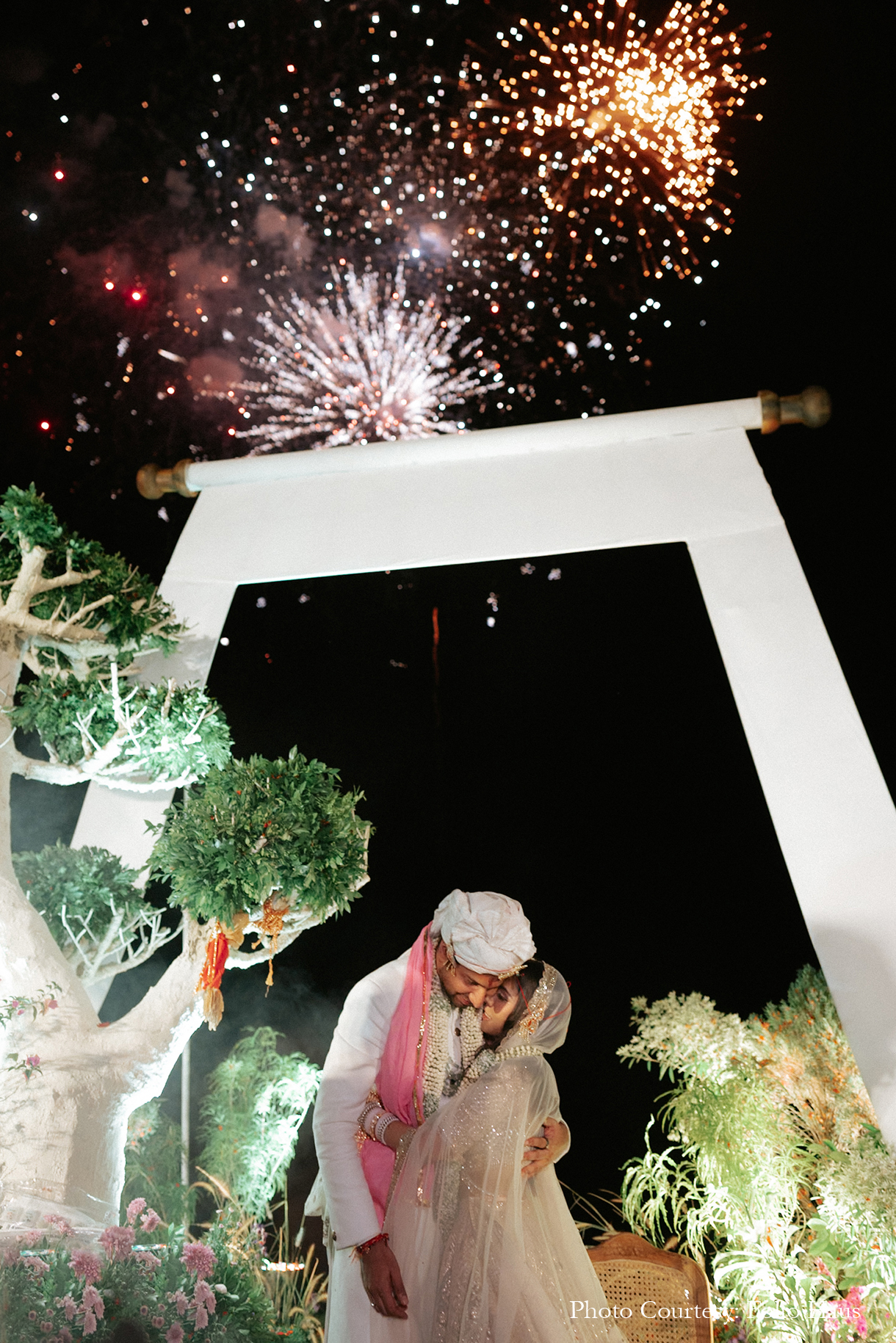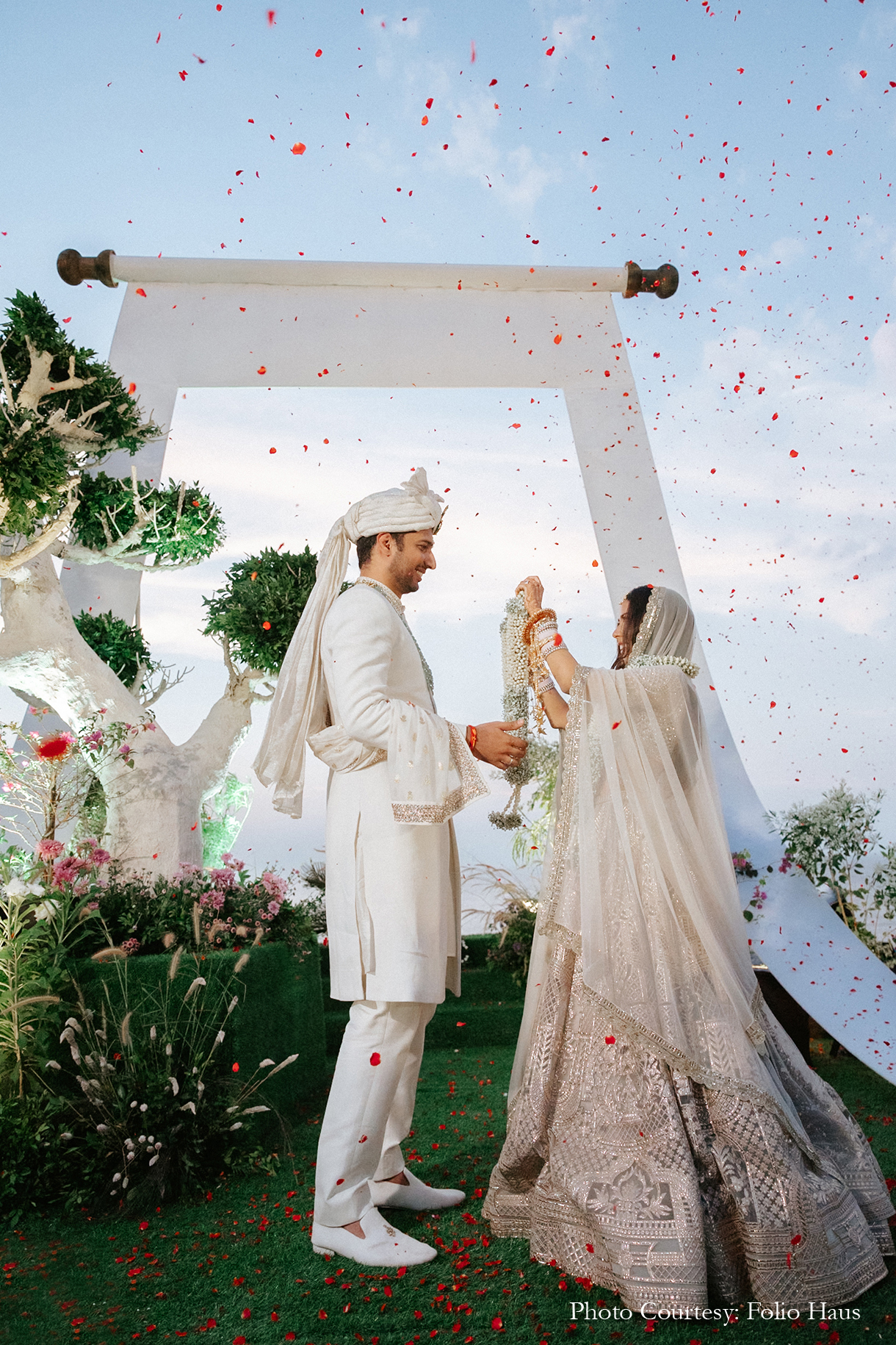 Devanshi shares, “The wedding mandap for the sunset pheras was an unconventional one. Rather than going for the usual four-pillared mandap, the couple opted for a mandap backed by the gentle sea, a white-trunked tree with a floor covered by faux grass. The aisle that led to the mandap was pristine white and lined by dainty blooms. Komal walked down the aisle with handpicked songs playing in the background and a special voiceover message for Akshay. Live classical musicians added a dash of musical magic to their varmala moment which also included a flower shower.