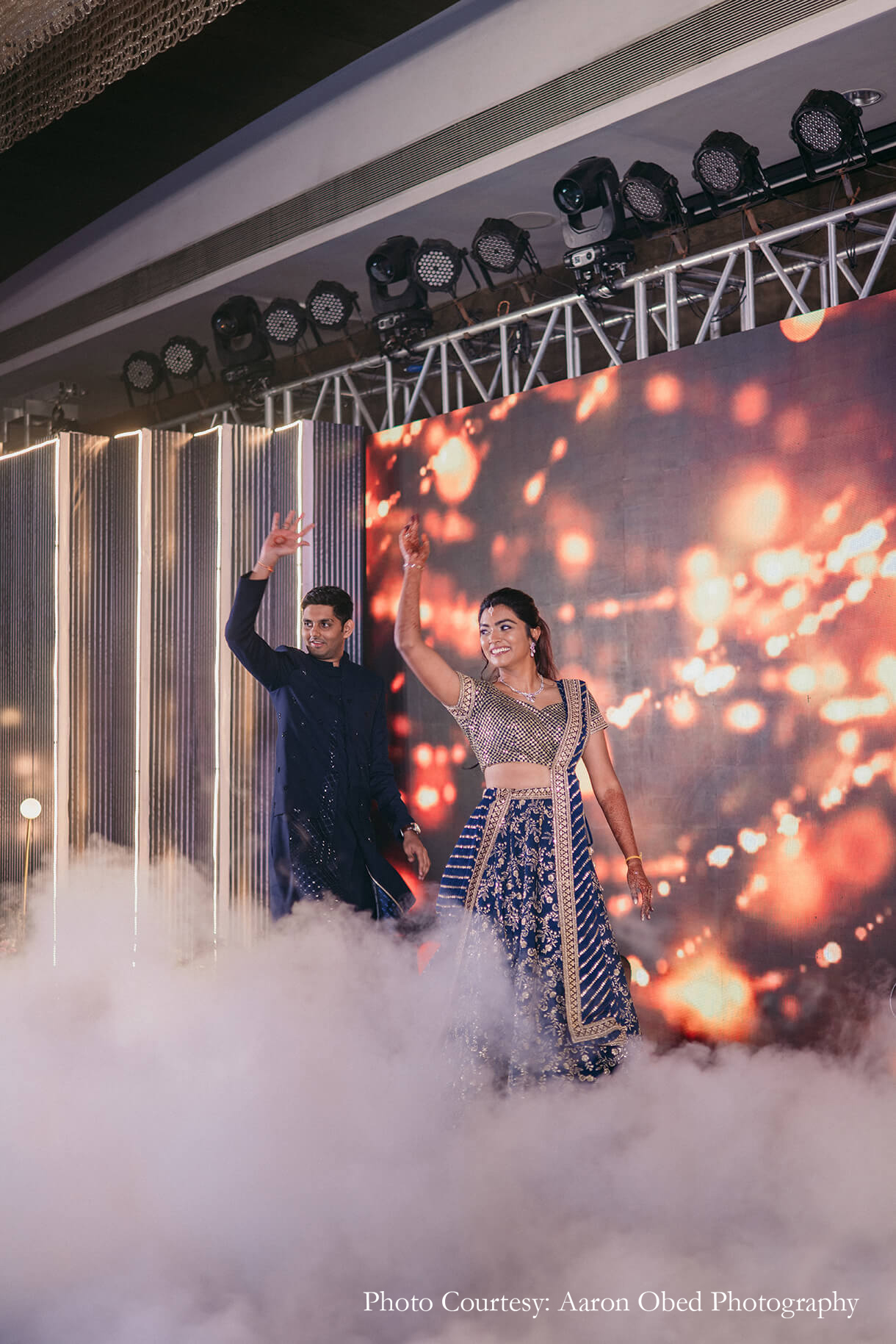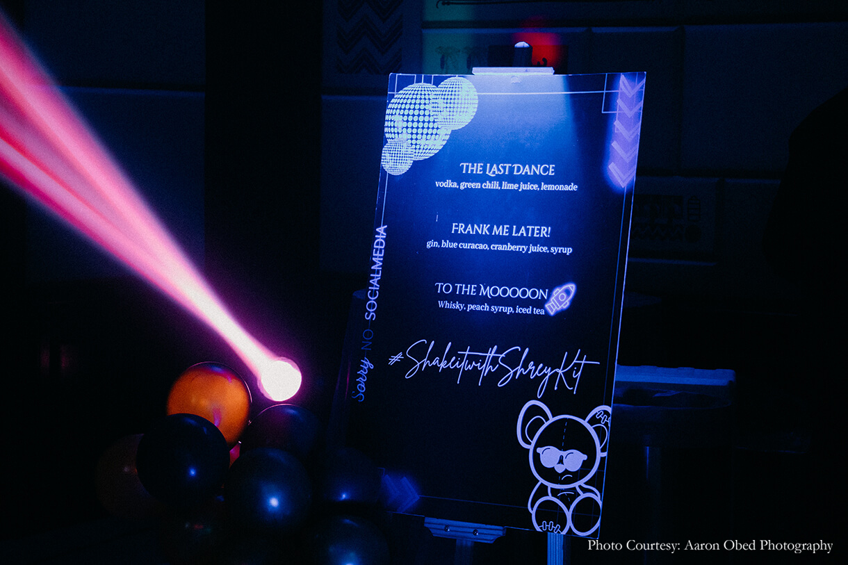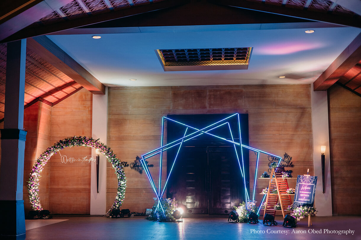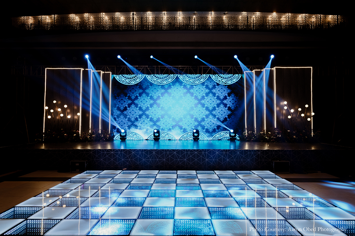 The evening transitioned into modern glamor with a glitzy Sangeet function. Clean lines, shimmering lights, and playful geometric patterns set a contemporary and edgy tone for the decor, while lights and flowers added a dreamy vibe to the occasion. The LED backdrop was a hit with the guests, as was the neon arch entrance for gorgeous photo ops for their friends and family.