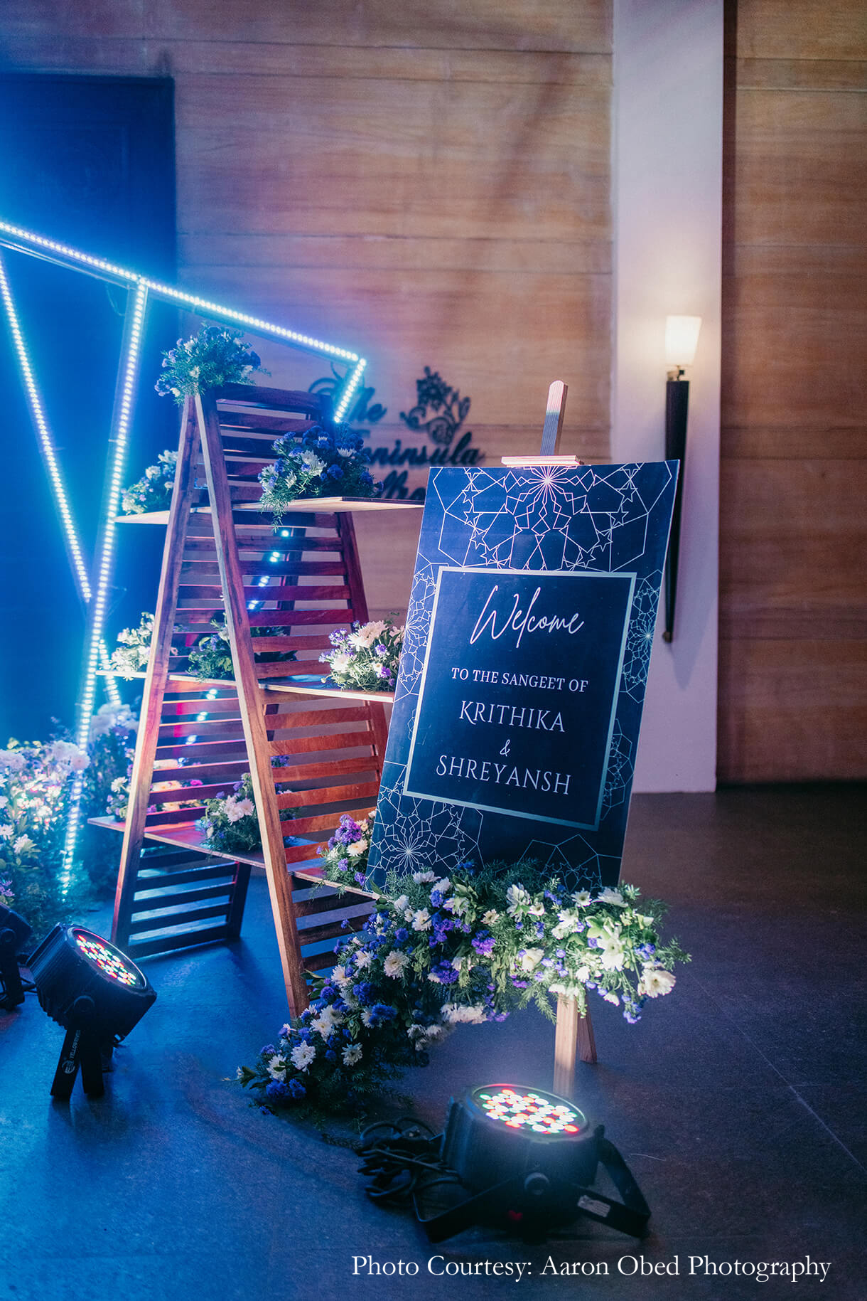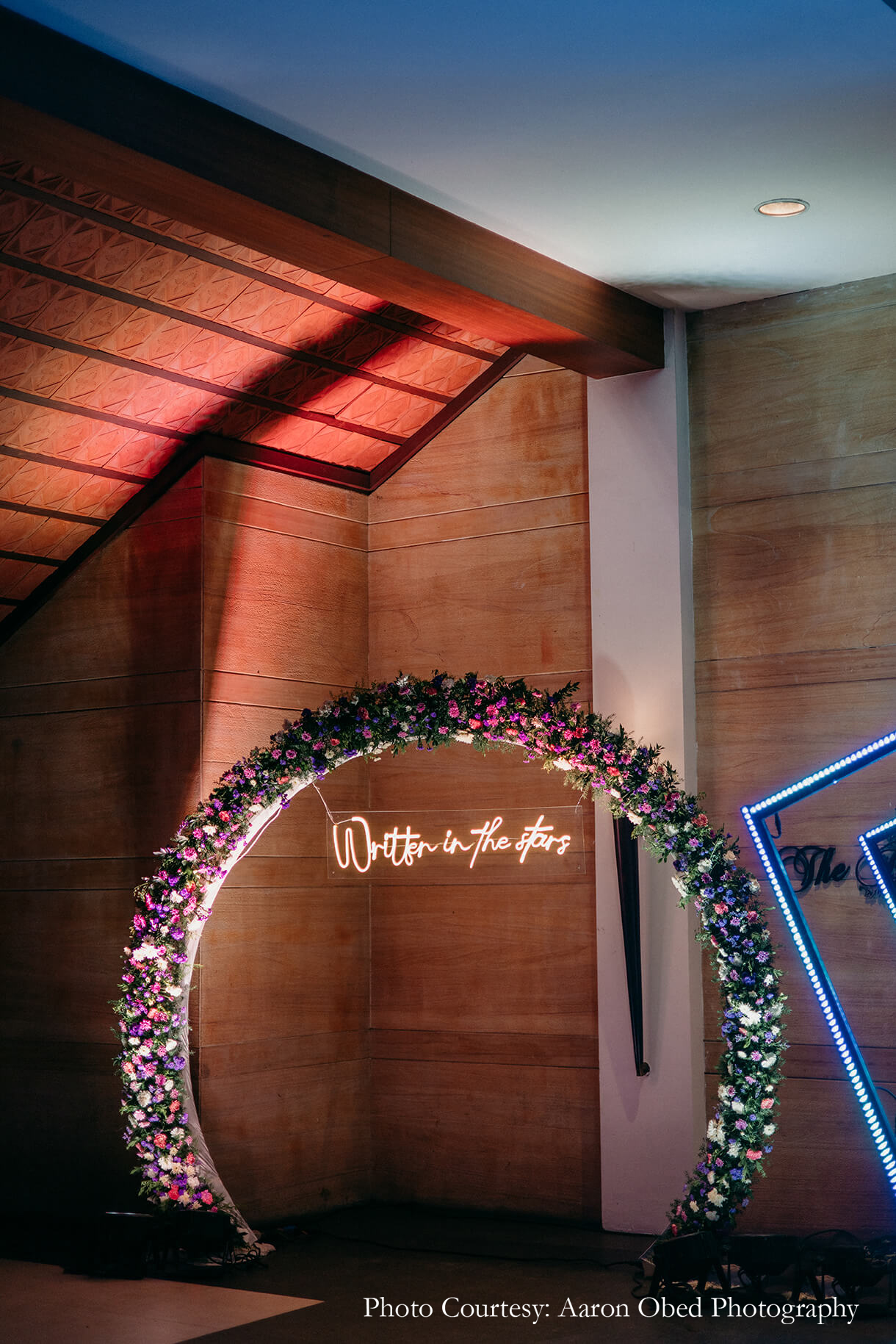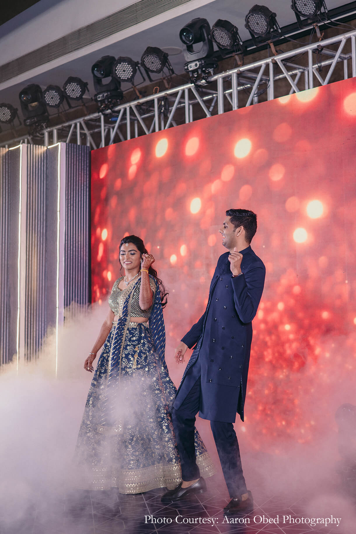 The evening transitioned into modern glamor with a glitzy Sangeet function. Clean lines, shimmering lights, and playful geometric patterns set a contemporary and edgy tone for the decor, while lights and flowers added a dreamy vibe to the occasion. The LED backdrop was a hit with the guests, as was the neon arch entrance for gorgeous photo ops for their friends and family.