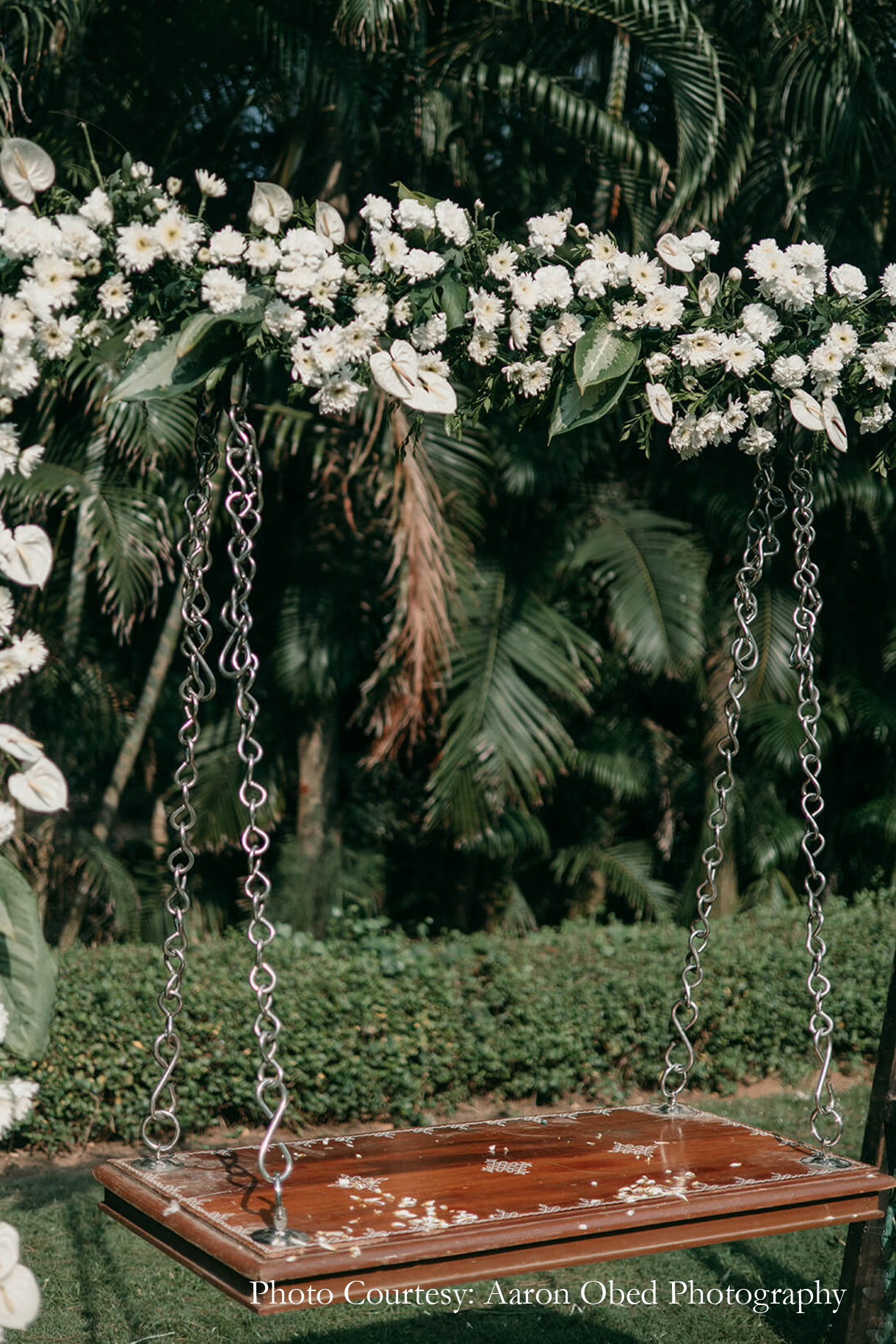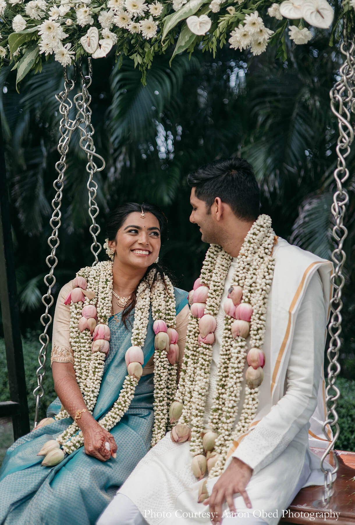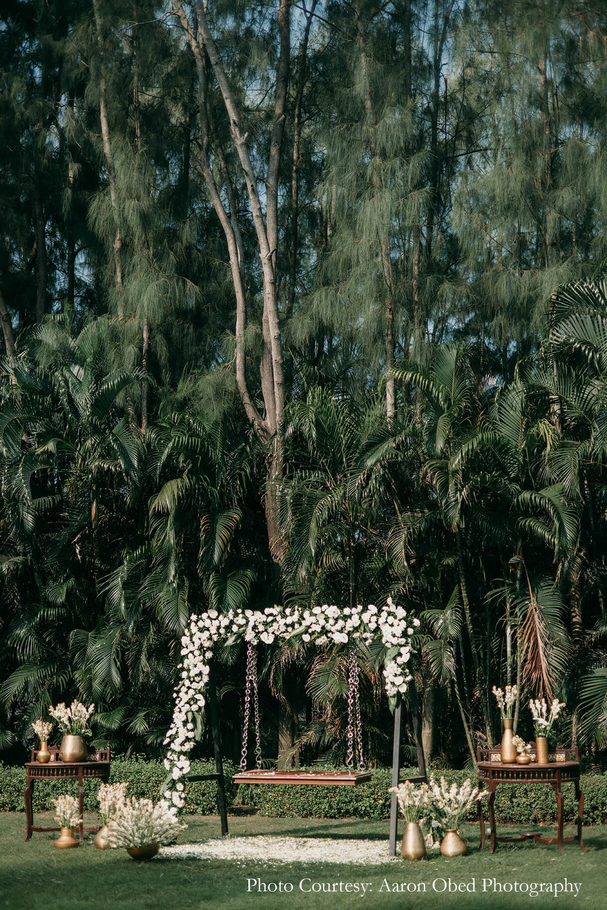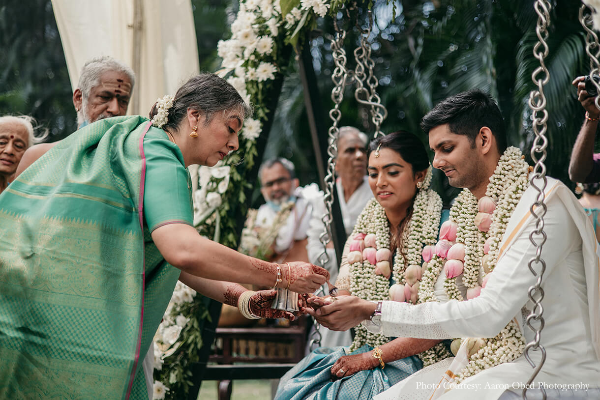 Steeped in tradition, the Oonjal and Elai Saapadu function was orchestrated in a tranquil palette of white and green. Brimming with flowers that covered the lawn, the venue evoked the essence of spring, while brass elements added an earthy, elegant feel to the space. A canopy of billowing white drapes added to the serenity, while the exquisite couple swing was a sight to behold.