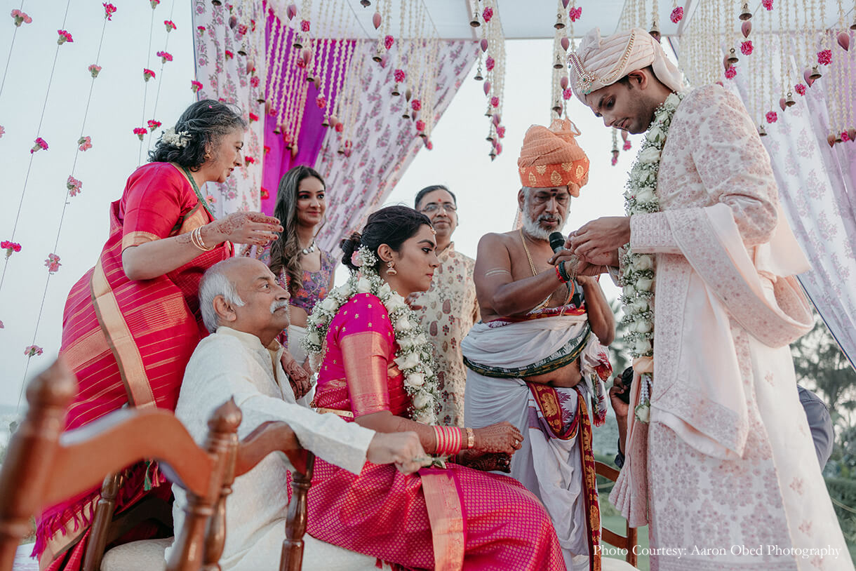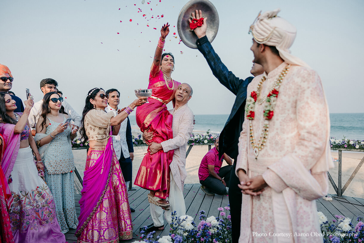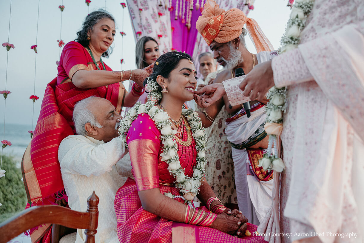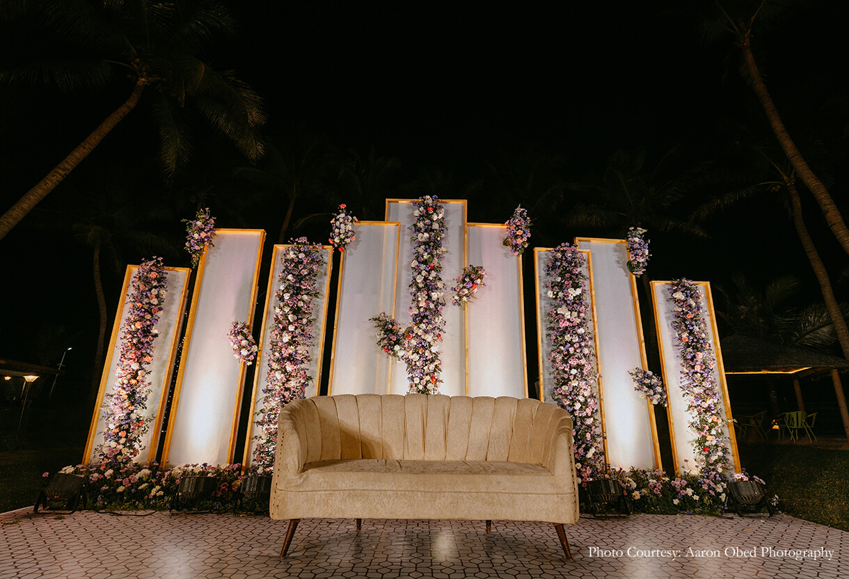 Imagined against the pristine backdrop of the Bay of Bengal, the couple’s varmala and phera ceremony was a harmonious blend of their distinct traditions. Crafted in a palette of pink, purple, and white with brass elements, the tranquil decor sought inspiration from different parts of the country. The mandap featured motifs that paid homage to the crafts of North India, with floral accents of lotus, marigolds, and tuberoses nodding to the customs of the South, beautifully signifying the union of both cultures. The couple exchanged varmalas amidst a flower shower on the deck, before tying the knot to the sound of ocean waves.