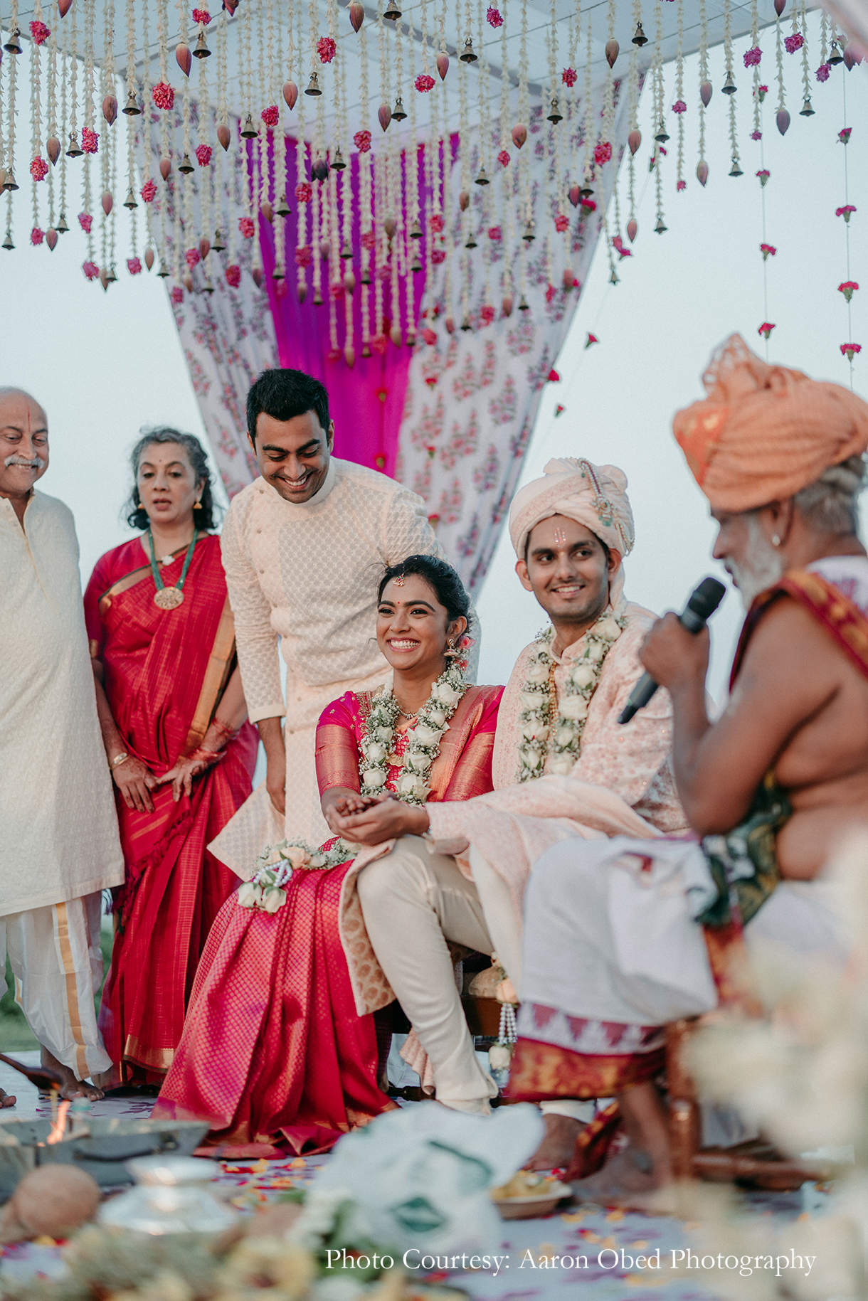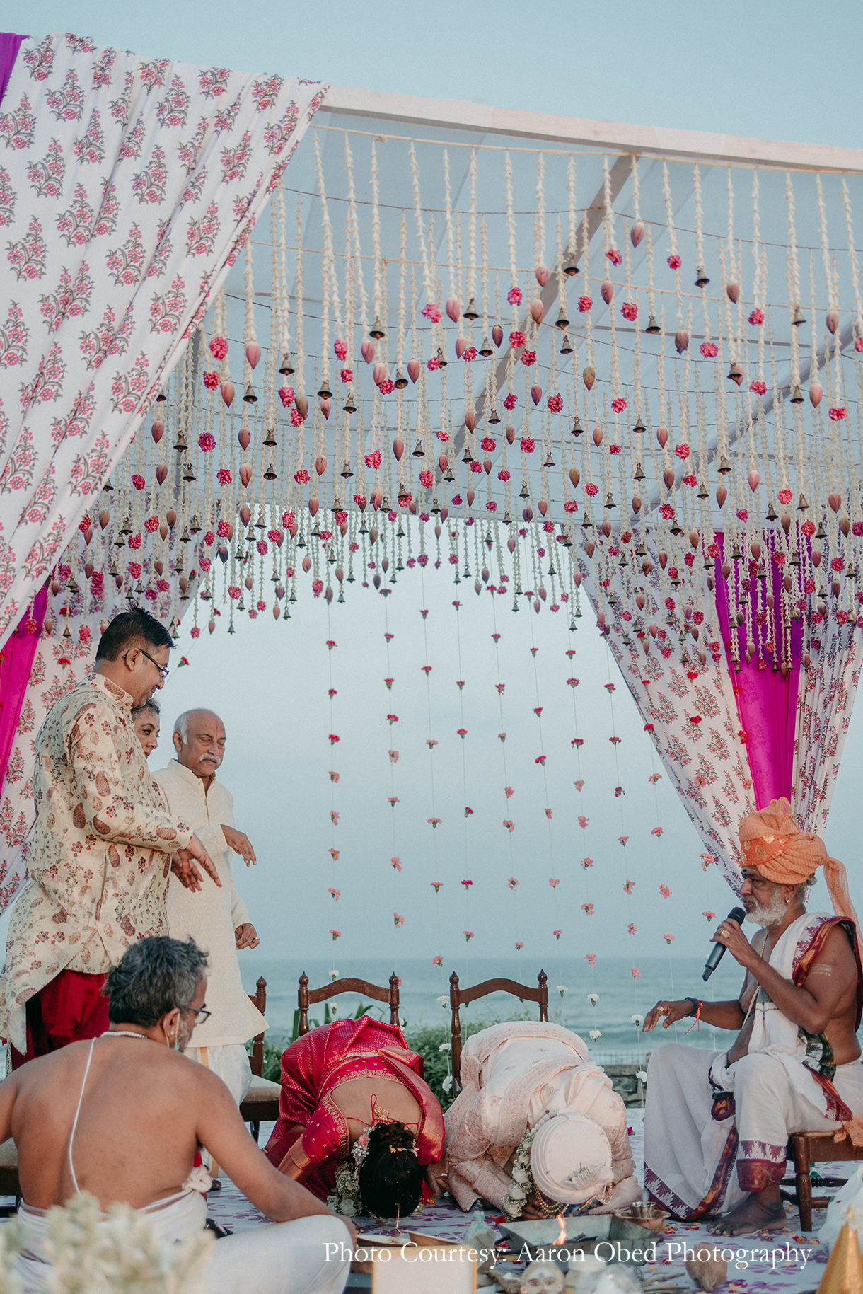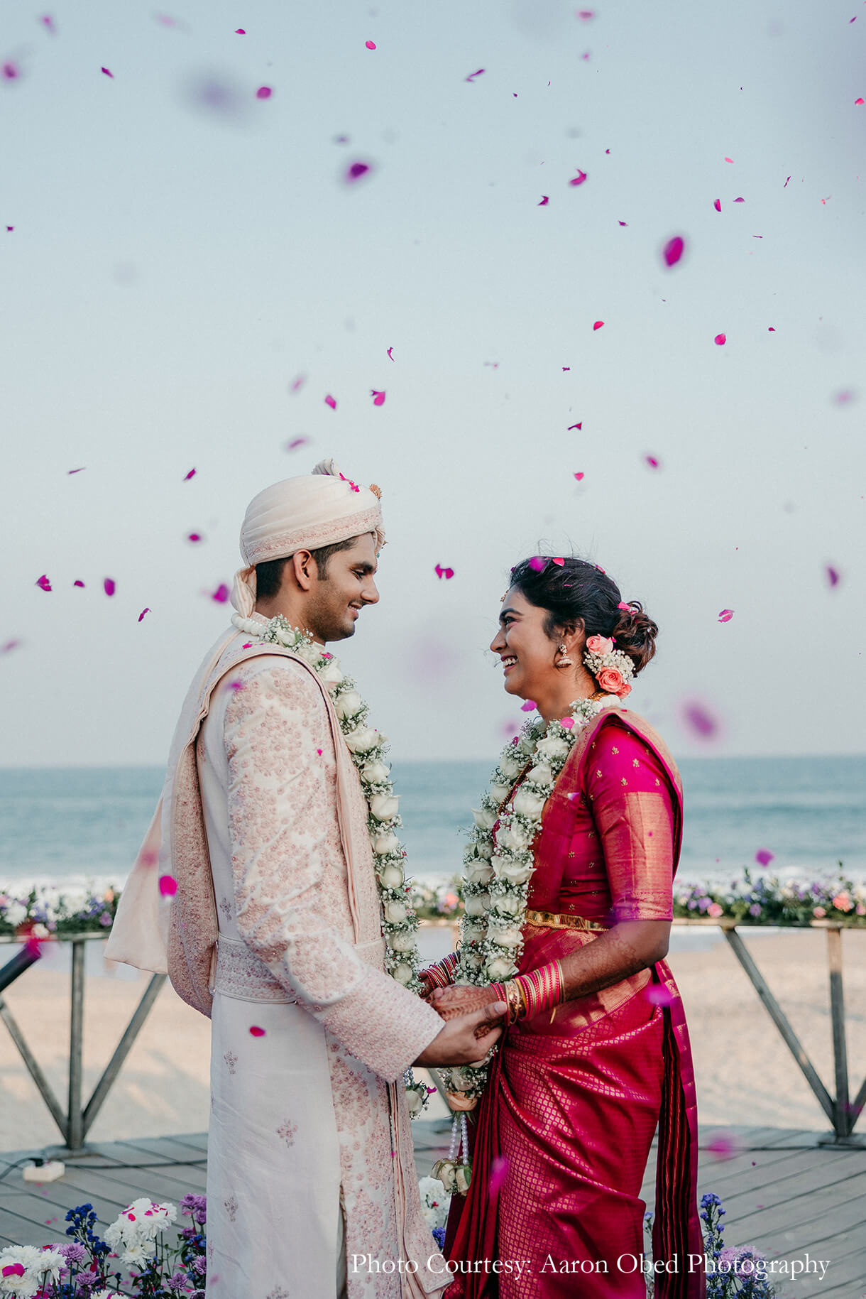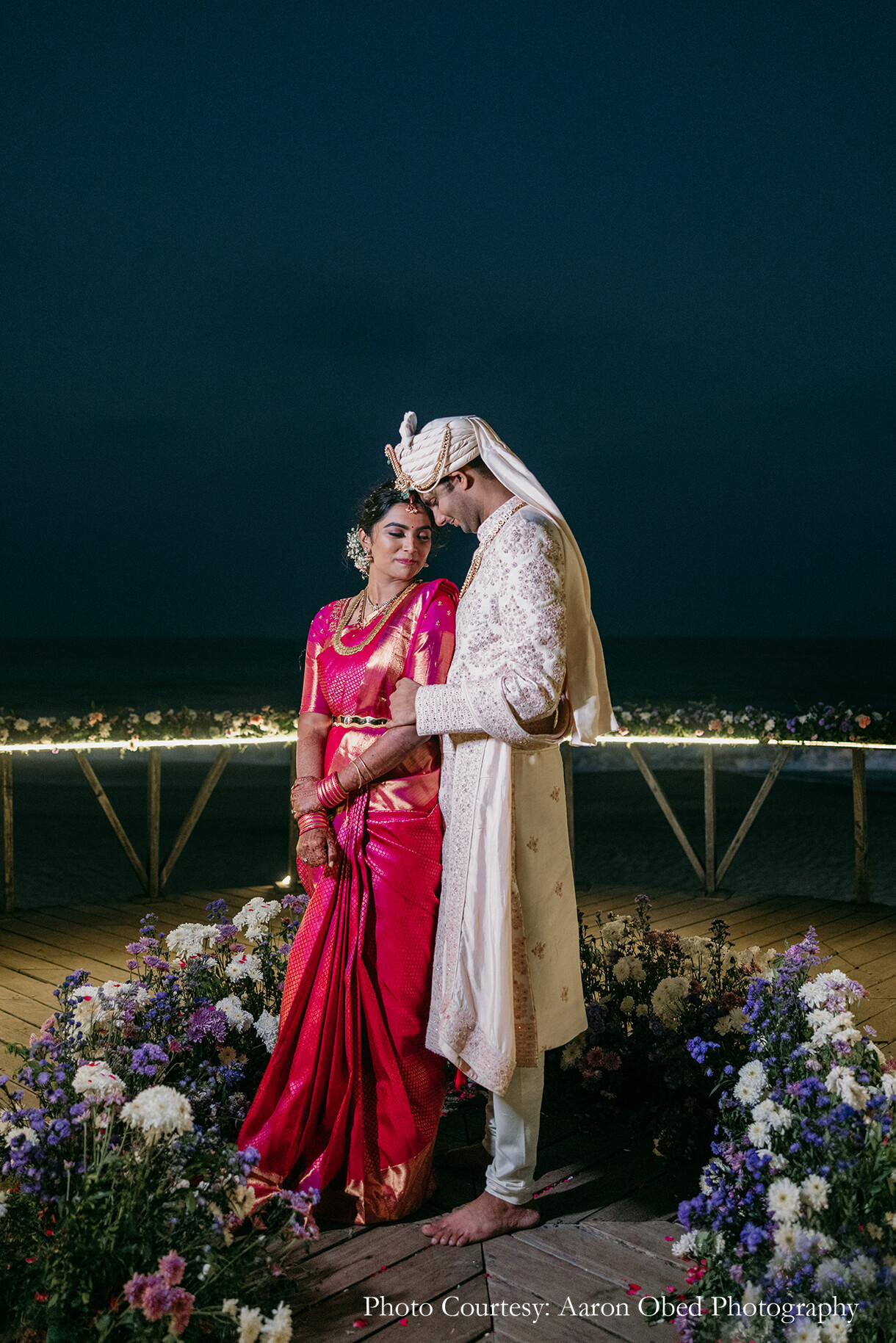 Imagined against the pristine backdrop of the Bay of Bengal, the couple’s varmala and phera ceremony was a harmonious blend of their distinct traditions. Crafted in a palette of pink, purple, and white with brass elements, the tranquil decor sought inspiration from different parts of the country. The mandap featured motifs that paid homage to the crafts of North India, with floral accents of lotus, marigolds, and tuberoses nodding to the customs of the South, beautifully signifying the union of both cultures. The couple exchanged varmalas amidst a flower shower on the deck, before tying the knot to the sound of ocean waves.