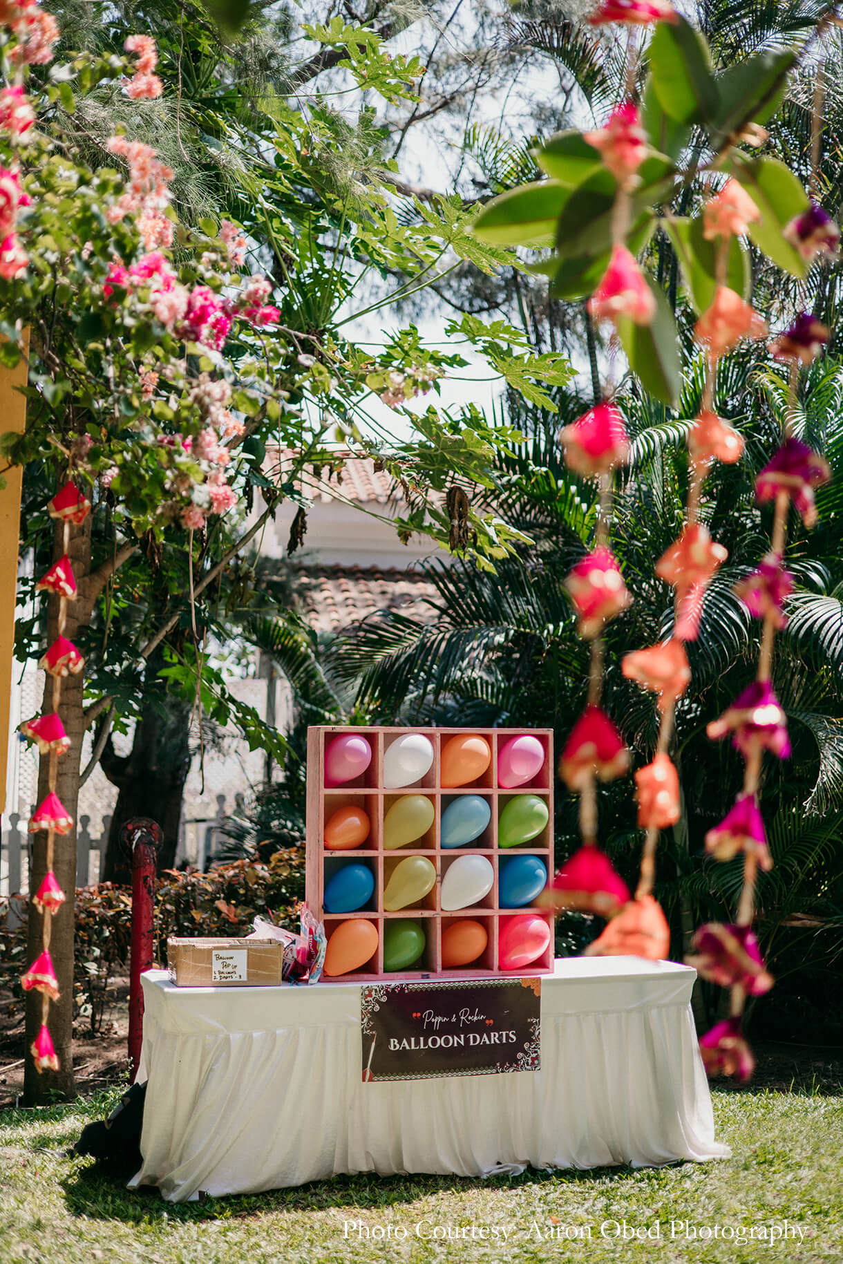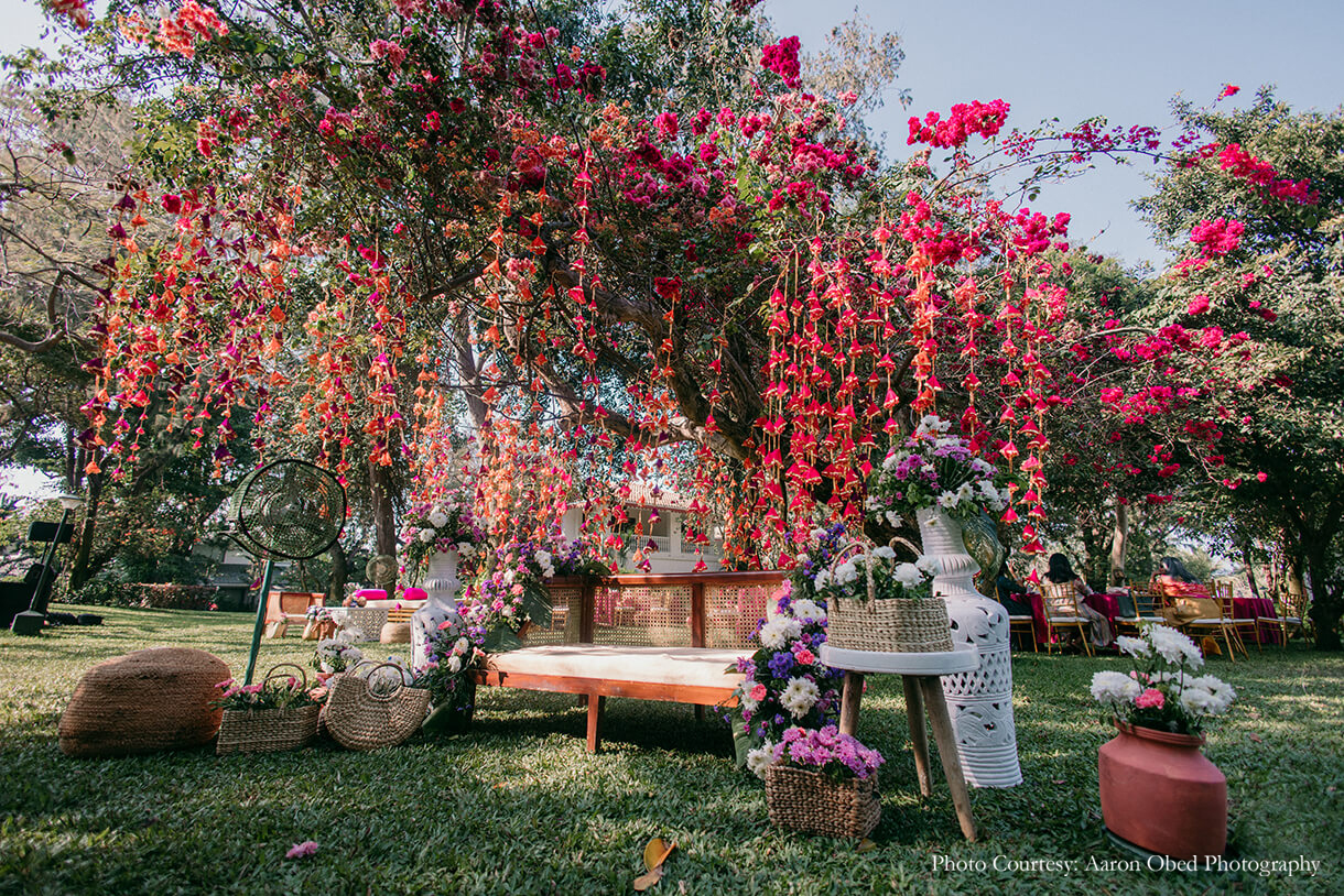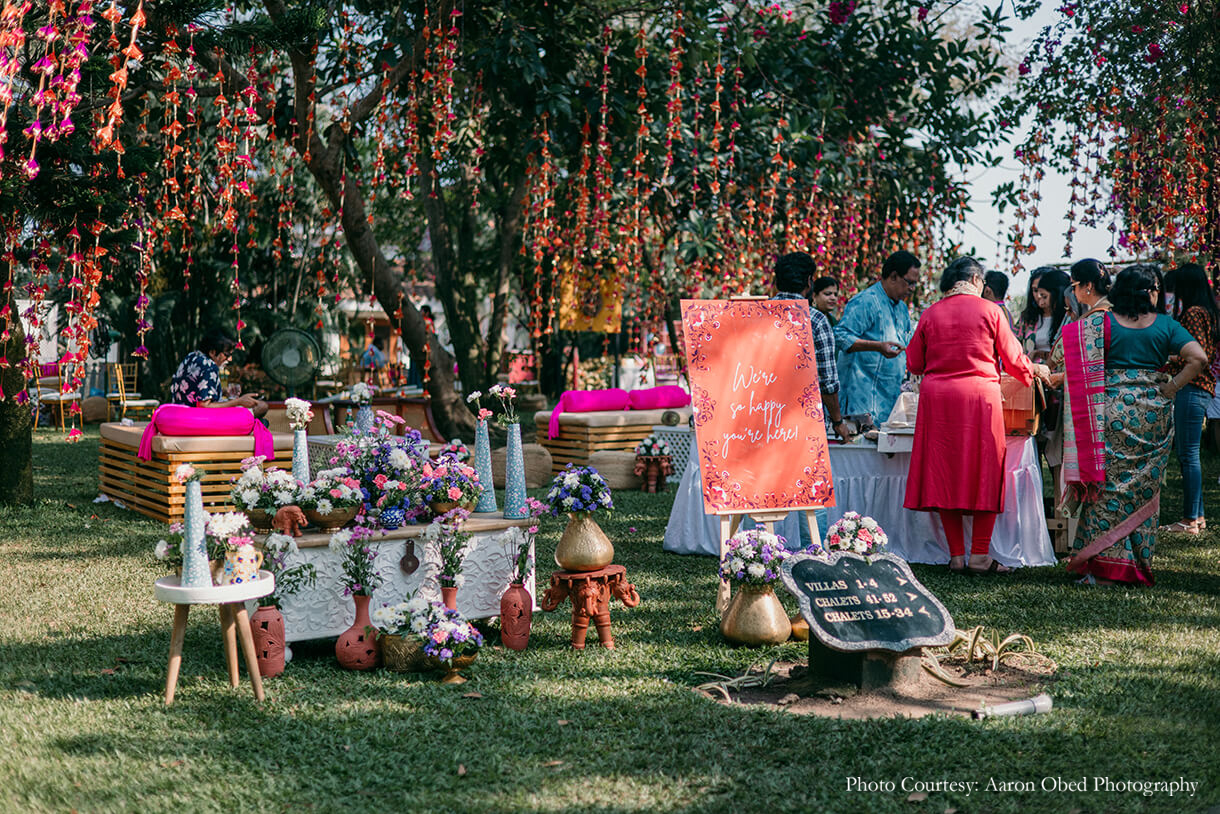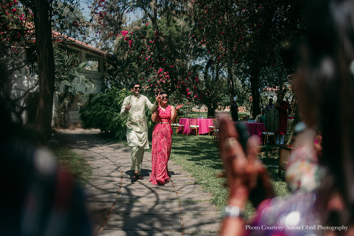 Starting the festivities on a high, the Mehendi function was full of colorful decor and fun activities. A vibrant combination of desi and kitsch elements added to the lush greenery of the space and the beautiful bougainvillea trees, while a mimosa bar and coconut carts helped guests beat the Chennai heat. Balloon darts, giant Jenga, mehendi artists, and more kept the guests entertained and engaged, along with a custom block printing station where guests could print tote bags they could keep as a keepsake.