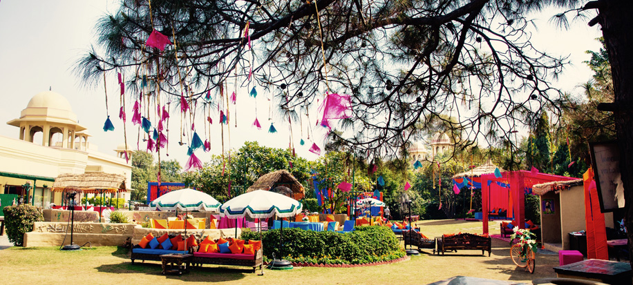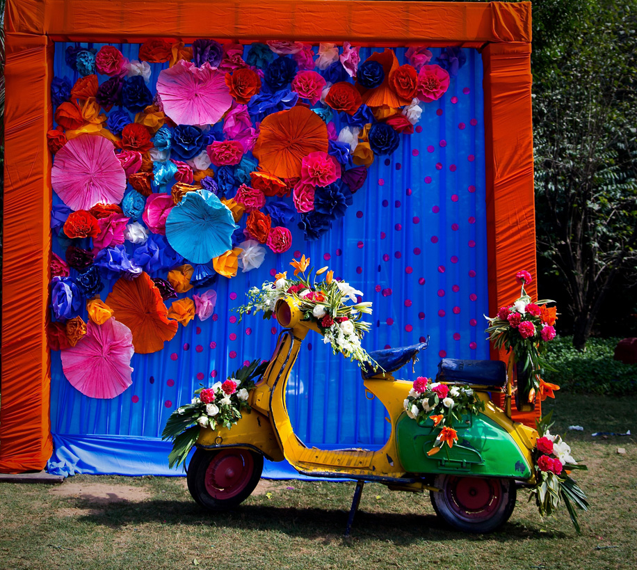 “The mehndi decor involved a peppy theme with colorful paper flowers, a cute photo booth, quirky props, and activity areas around the vast lawns of the hotel. We completely transformed the decor and added a dash of quirkiness to our mehndi function with colorful floral decorations.”