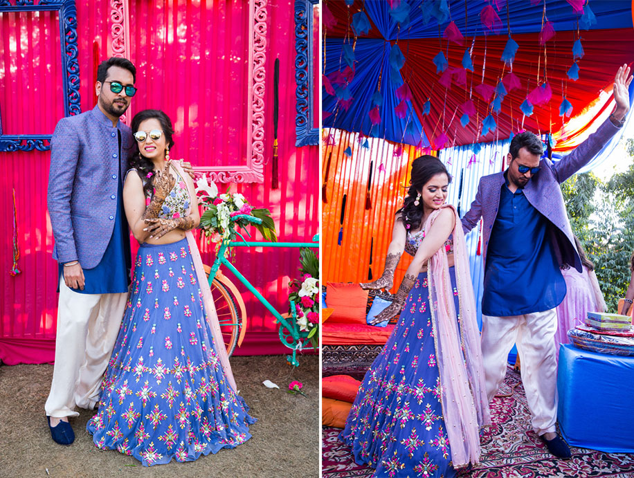 The bride wore a gorgeous blue and pink floral lehenga by Neha and Kriti, and Nakul wore a matching blue kurta and jacket which he paired with white pants. The ceremony was vibrant with lots of music, dancing and family revelry as Kriti got intricate and beautiful mehndi designs on her hands and feet.