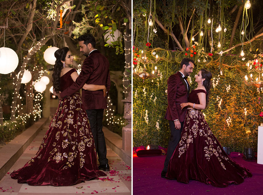 “We decided on a crimson-wine colored theme for the engagement. I picked a beautiful wine colored lehenga with gold-thread motifs by Neha and Kriti, and paired it with bespoke diamond jewellery. Nakul wore a matching wine colored tuxedo with a white shirt and a bow tie. We celebrated the event with cake cutting and then let our hair down to the latest Bollywood hits. It was an intimate, close-family-only event.”