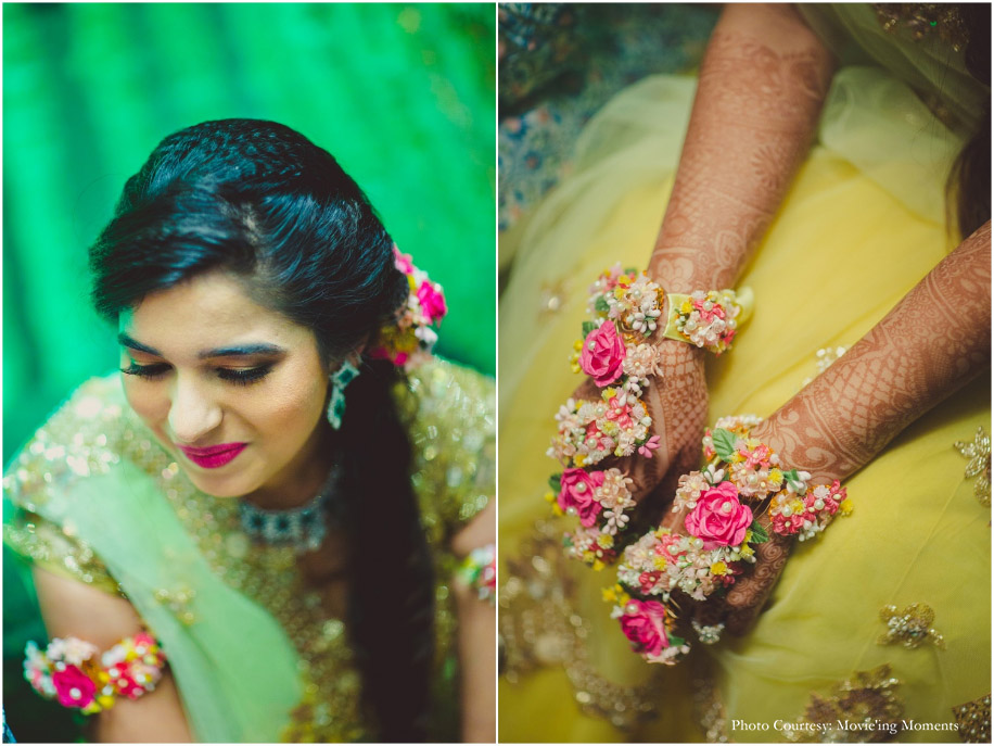 I wore a yellow lehenga by Peppermint Diva by Deepika which I paired with floral jewellery from Petal Jewels by Nikita. Aakash opted for an outfit by Govinda Mehta.
