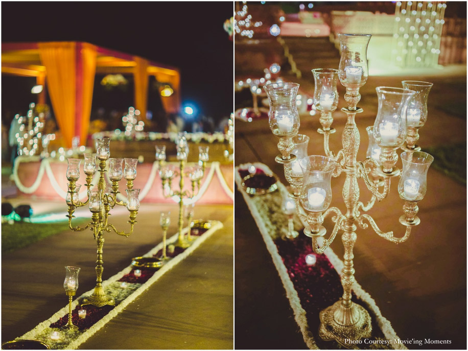 The wedding decor was all about recreating the charm of regal weddings of the past. We had large orange gazebos, and glass chandeliers and our mandap was smothered with fresh flowers.