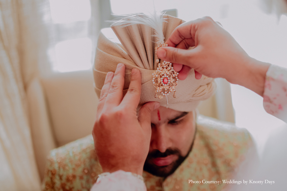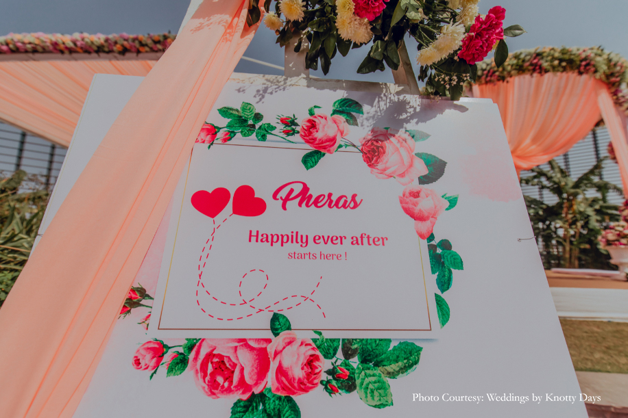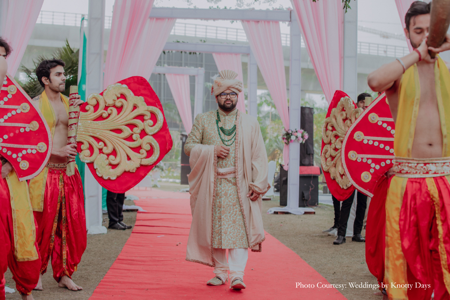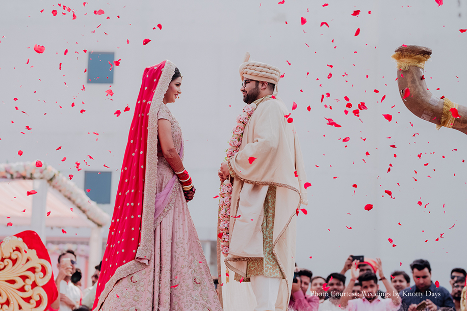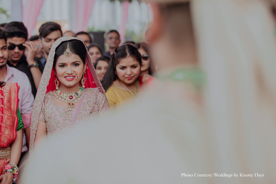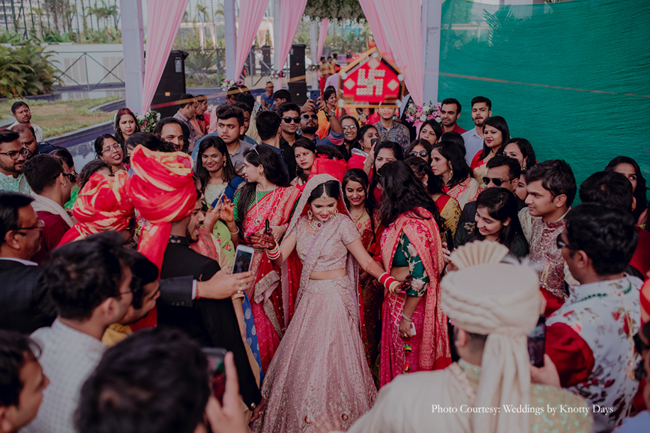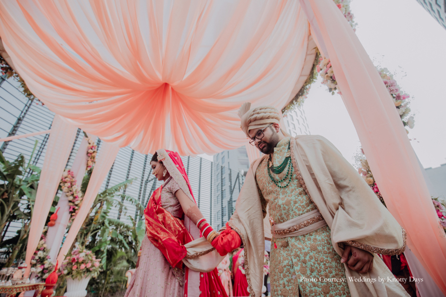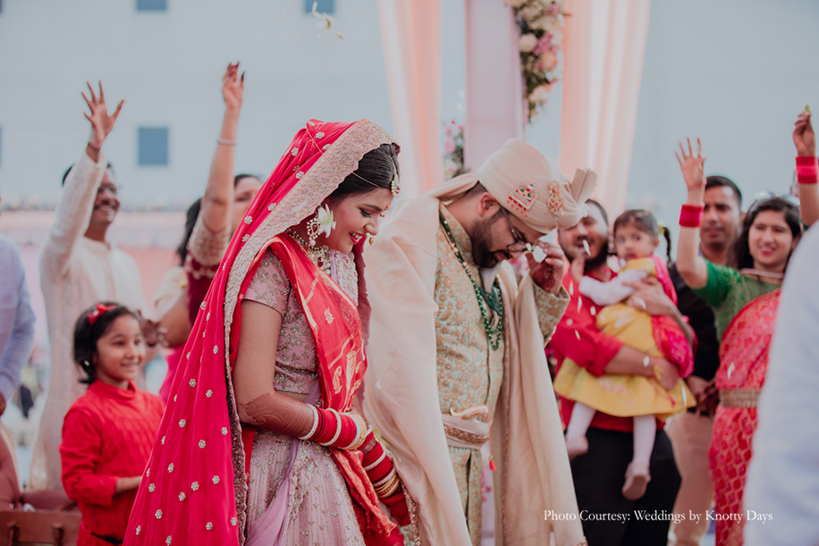 Lisha and Abhinandan’s nuptials were a day ceremony with the couple performing their pheras under the blue sky. The color scheme for the ceremony was centered around pastel shades and included elements like drapes. The bride entered the ceremony escorted by her father and brother. Lisha looked gorgeous in a dreamy pink lehenga that replicated her mother’s bridal demeanor. She balanced the look with a maroon veil fixed on top of her head. The embroidery on the lehenga was in light gold zardozi. Abhinandan also looked splendid in a peach and cream sherwani and a matching turban.