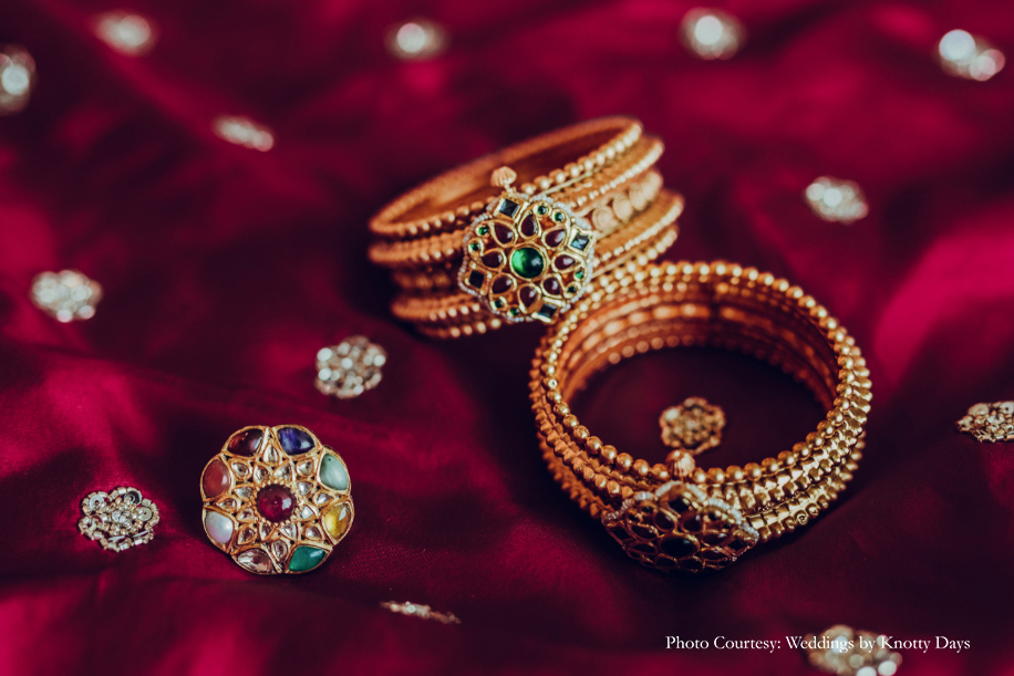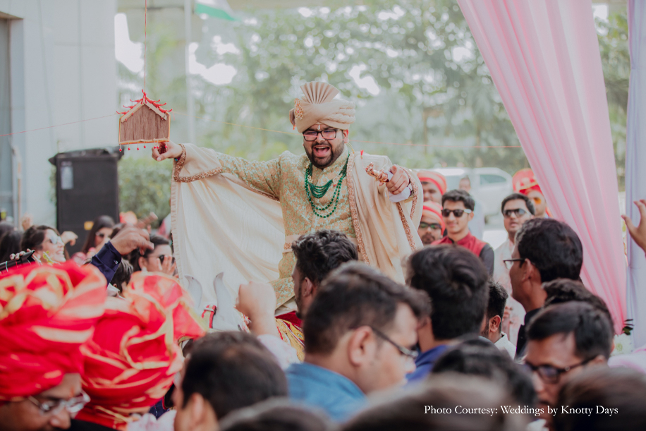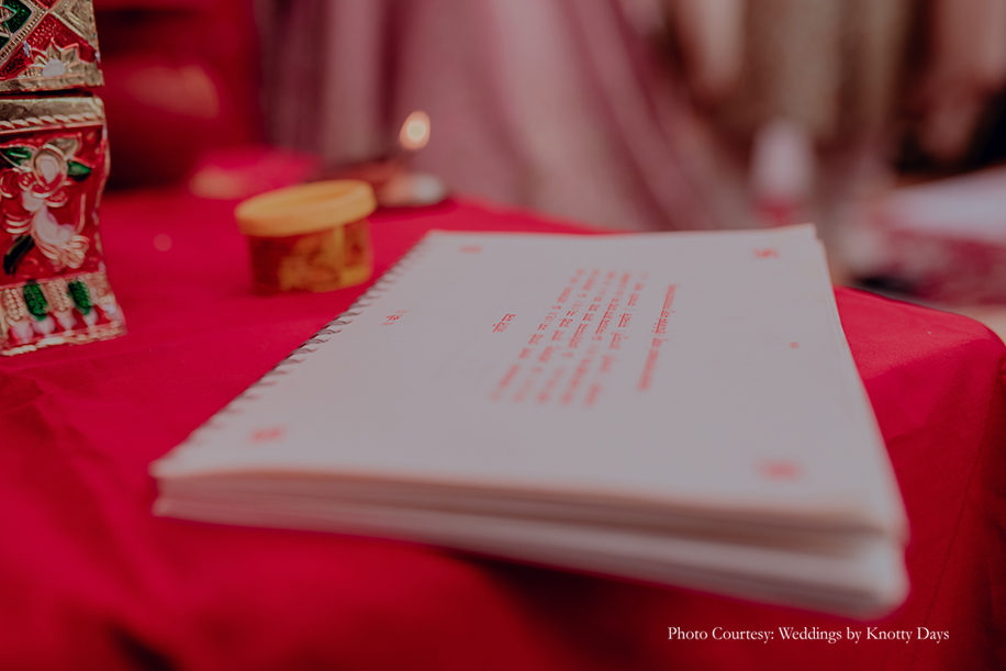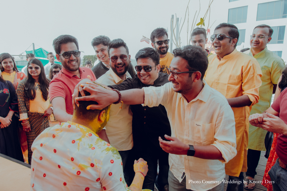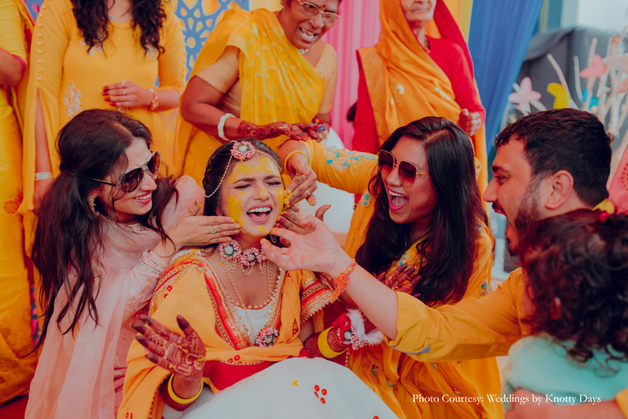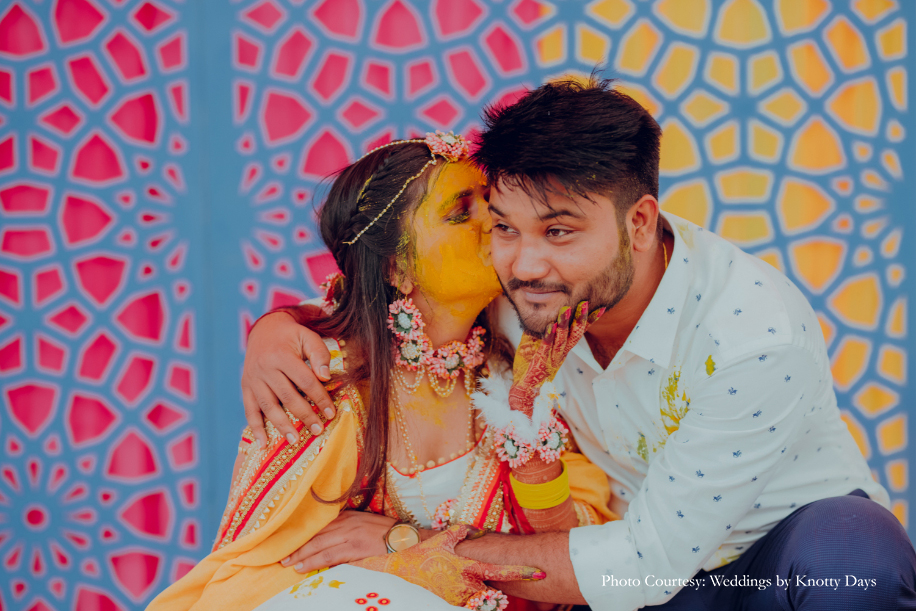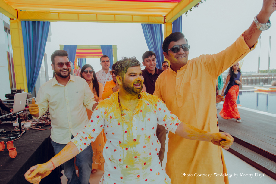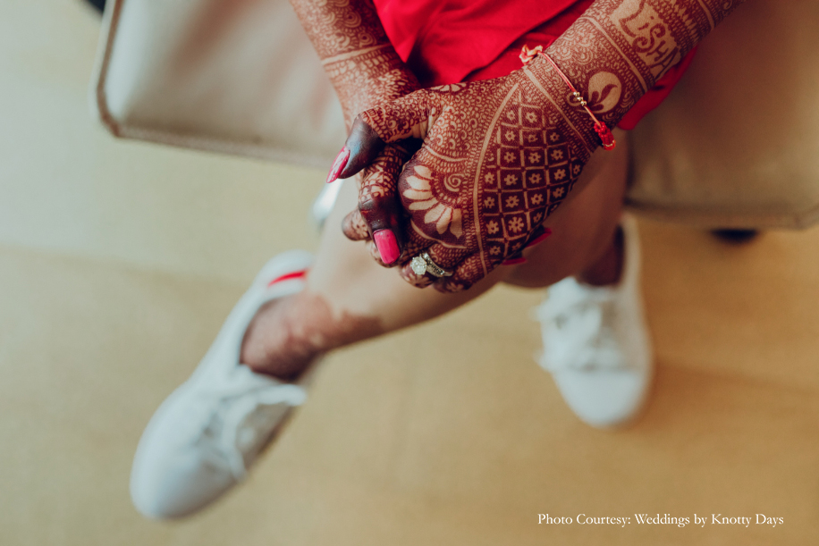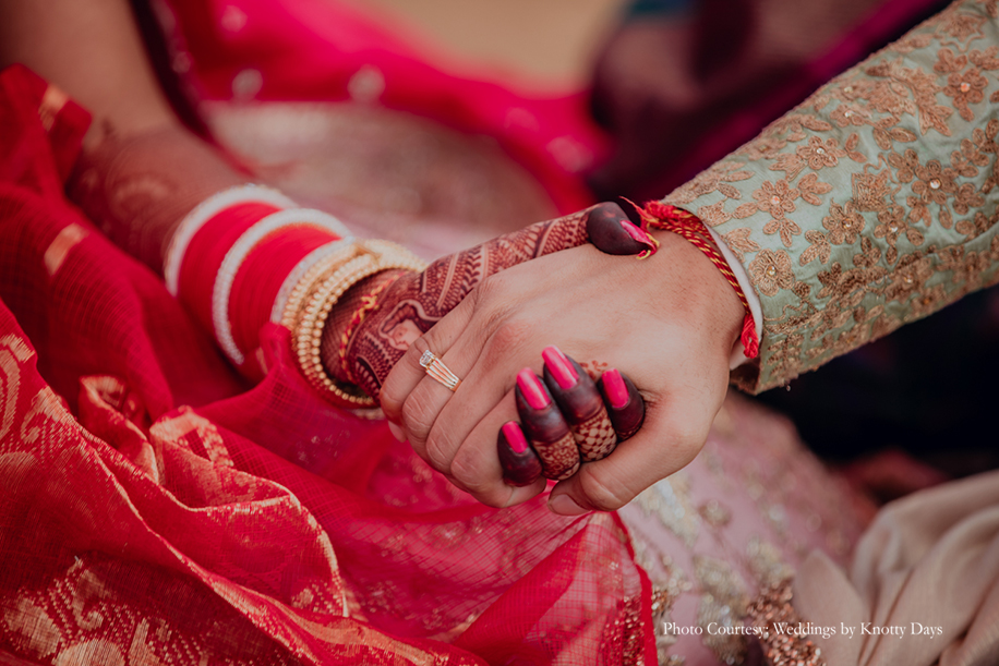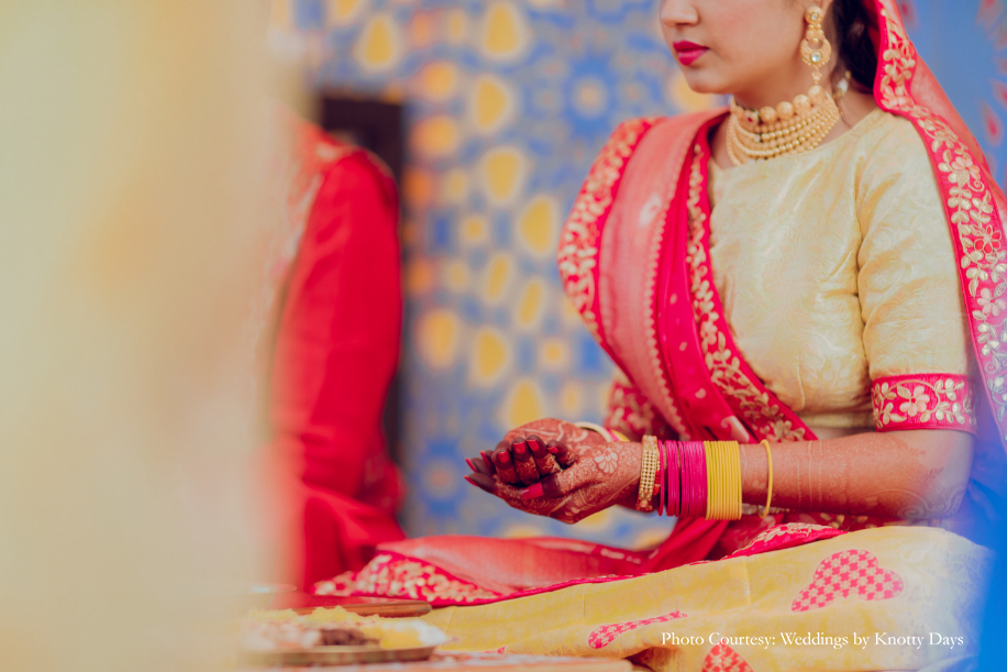 Lisha’s ‘Bhaat’ ceremony was a colorful event that saw lots of gorgeous dreamcatchers used in the decor. The ceremony saw the couple’s families and friends come together and have a fun time, as reflected in the happy images captured by the team at Weddings by Knotty Days. Lisha looked radiant in her yellow and red lehenga that was accentuated by a red benarasi dupatta. Her gold choker and delicate borla ‘matha patti’ (forehead ornament) completed her traditional look.