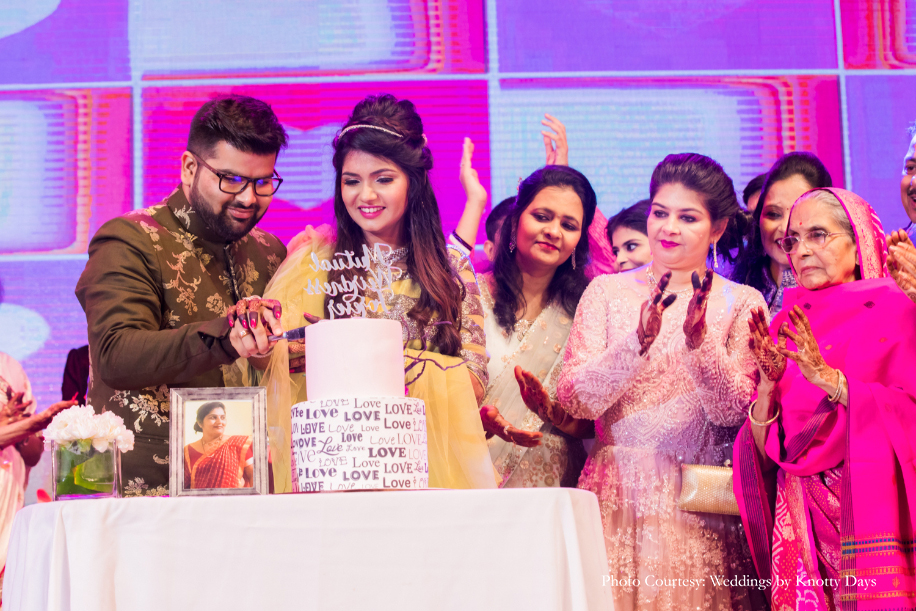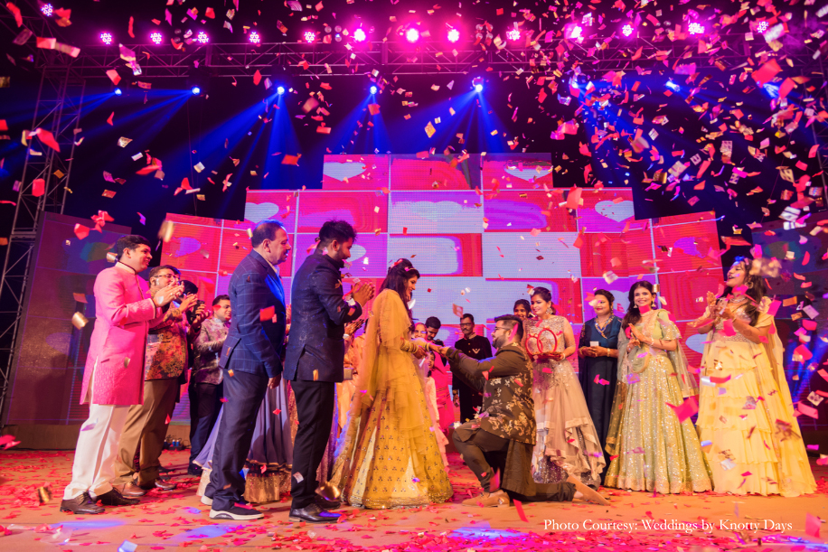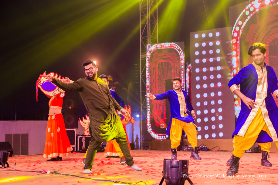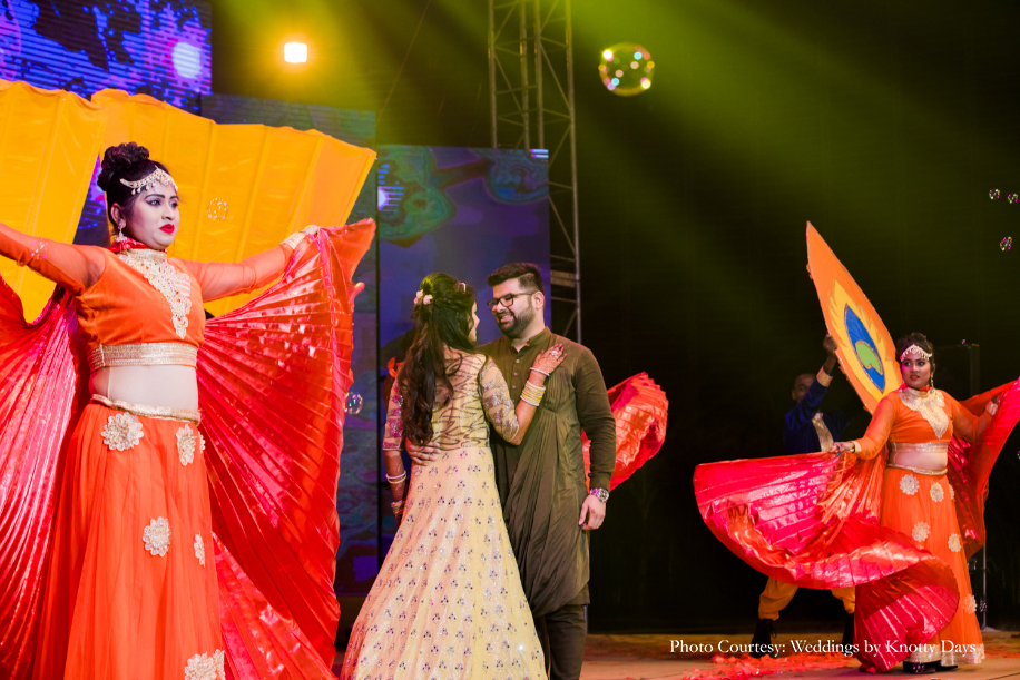 Lisha and Abhinandan’s sangeet was an extravagant affair. The decor was done in shades of purple, shades of purple, and the magnificent stage looked straight out of a Bollywood awards night. Lisha chose to wear her favorite color – yellow. Her sunny Lucknowi gown with grey mirror work made for quite a pretty sight. Abhinandan, on the other hand, looked dapper in his military green Indo-western sherwani.