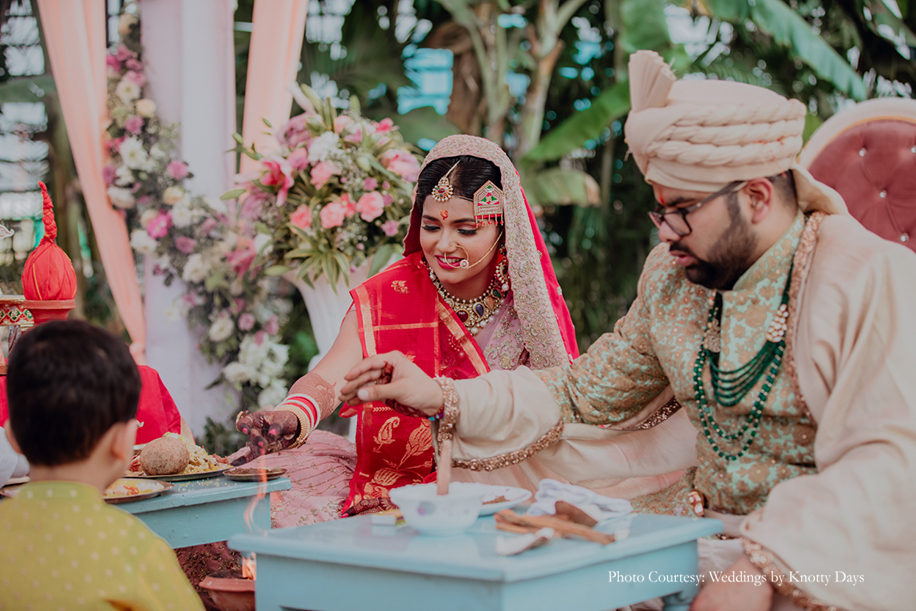Lisha and Abhinandan’s haldi was a lively ceremony rich in colors. With a vibrant palette of yellow, pink, blue, and green, the ceremony saw guests showering their love and blessings on the couple by applying thick turmeric paste on them. Lisha wore a gorgeous white lehenga for the ceremony, made from the famous Bengali taant fabric with red thread-work. The look was balanced with an ochre dupatta, a gorgeous floral necklace and forehead ornament that made her look no less than a dainty princess. The groom’s white kurta with red thread work design matched his bride’s look.