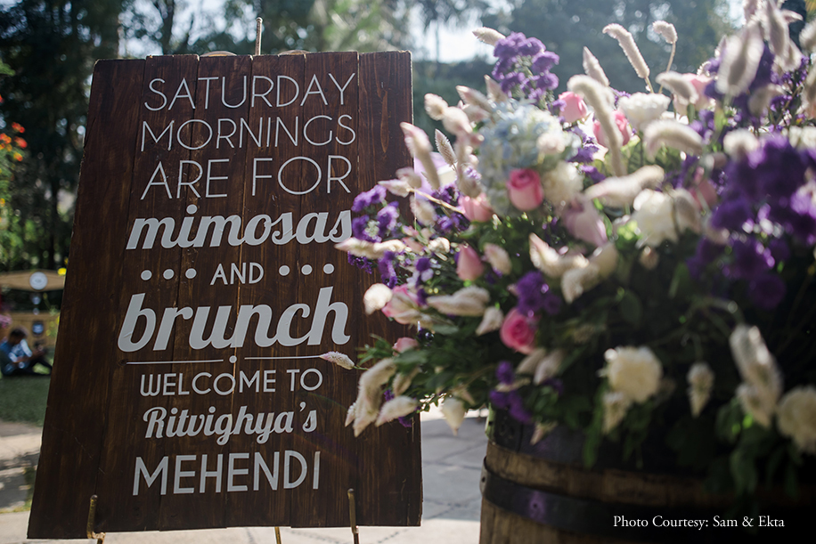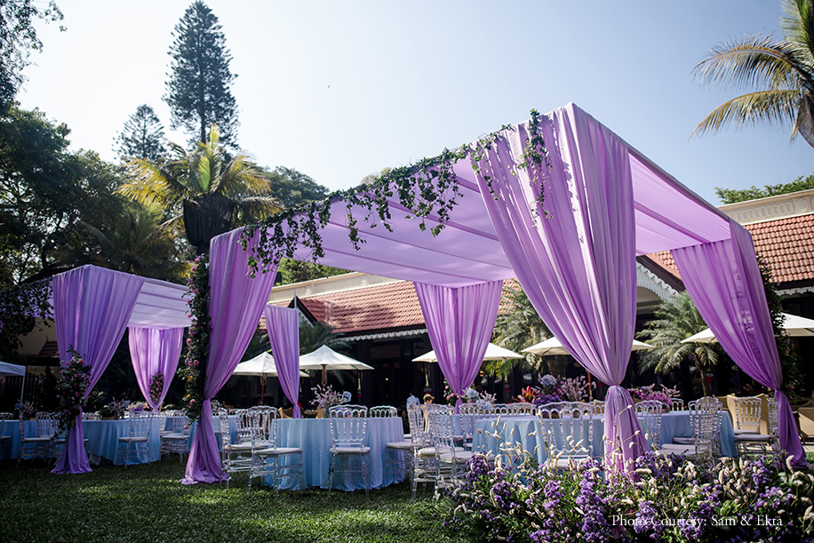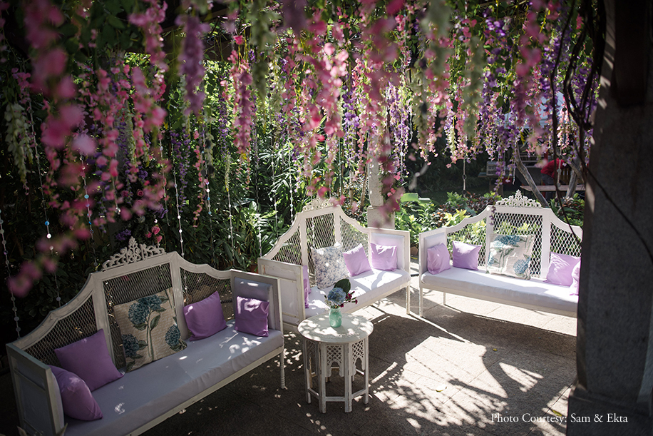 Swathed in shades of lavender, the mehndi had distinct feminine charm which was punctuated by purple, pink and baby blue blooms. The sprawling lawns of the venue were peppered with delicate chairs under a canopy of lilac drapes where guests could enjoy quirky cocktails. Madhuri glowed in a hot pink embroidered lehenga and lime green dupatta set which she accessorized with an intricate gold necklace and earrings. The groom, however, opted for a lilac chikankari bandhgala with a gold breastpin for this occasion.