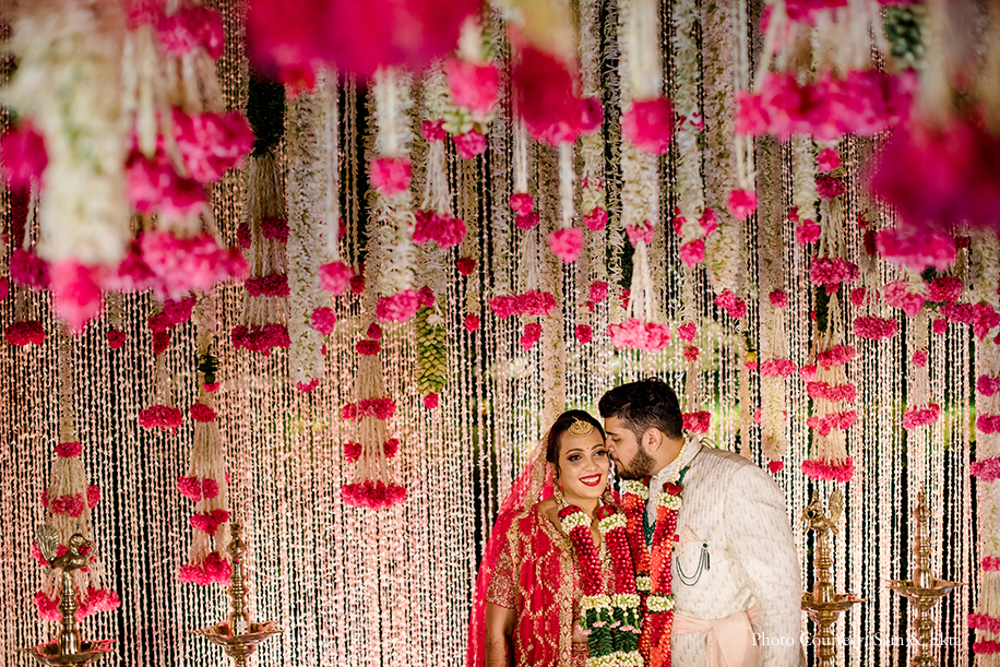 For the big day, the duo chose to go ahead with a ‘Modern Flowers’ decor theme with a touch of South Indian nuances. As the newlyweds posed on a stage decked with white and pink flowers, both of them were a picture of happiness. Adding a soft glow to the occasion were ornate brass diyas that were carefully lit all over the venue.