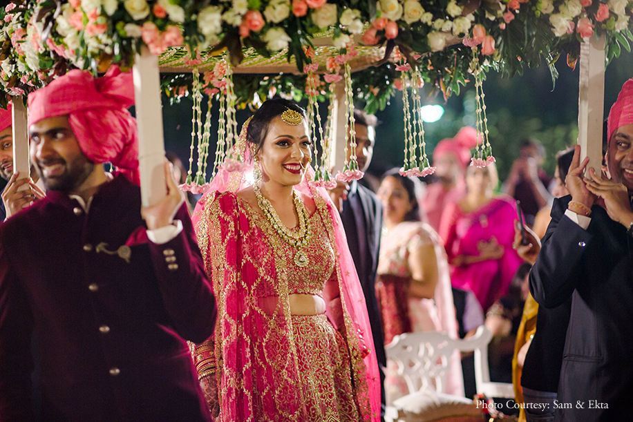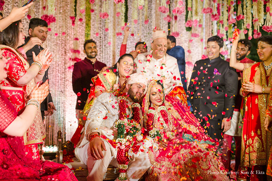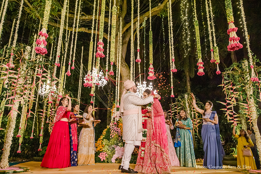 Bride’s Outfits: Shantanu Goenka (Tilak, Sangeet), Neetu Gupta, Bangalore (Mehndi), Gaurav Gupta (Cocktail), Kresha Bajaj (Wedding)