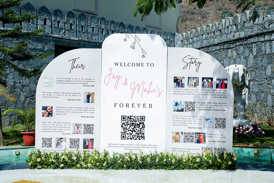 Mahi shares, “We decided to create a storyboard for the welcome decor that resonated with the details of our love story. This personalized touch set the tone for the entire event, giving our guests a glimpse into our journey together.”