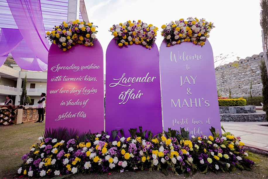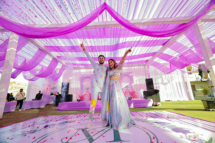 Jay shares, “Our Haldi ceremony was fun with a vibrant lavender theme. The highlight was our wedding logo which was prominently displayed. We organized fun games, and everyone danced their hearts out, making it a joyful and memorable event.”