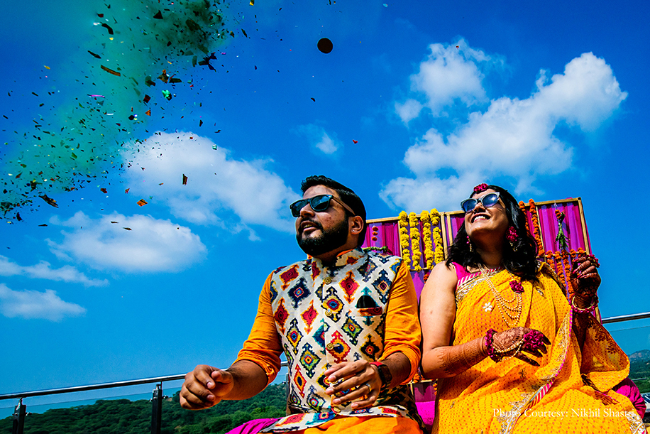 The haldi held by the pool was like a postcard with pops of yellow, orange and fuchsia in a picturesque contrast with the clear blue skies and lush greenery. A suffusion of marigolds and seating arrangements decked up in Rajasthani mirror-work added an ethnic pique to the visuals.