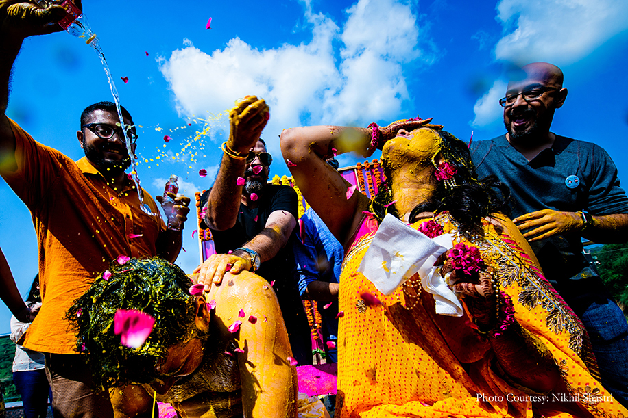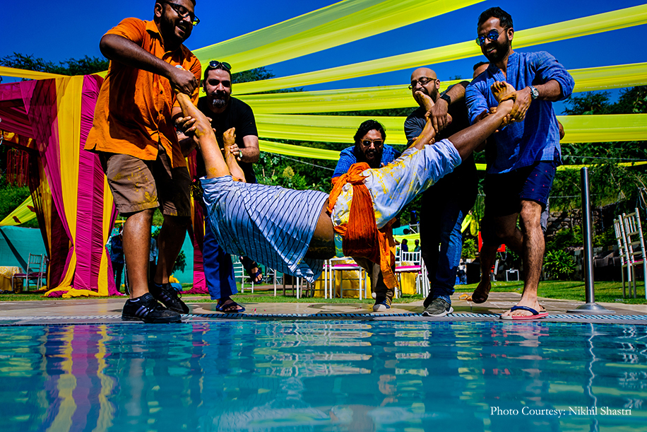 The bride herself, in a yellow sari with fuchsia floral jewelry was a vision of summer! The guests showered rose petals and confetti on the couple as they were doused in turmeric paste, and then splashed into the pool.