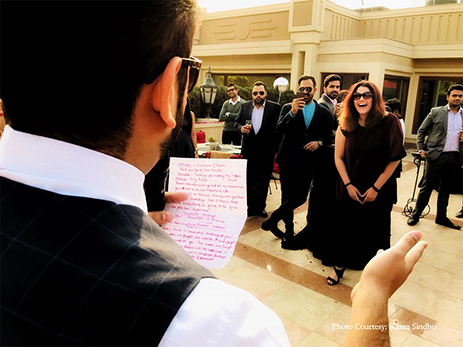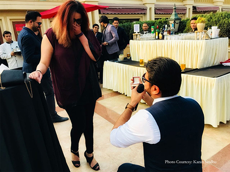Harsh decided to ditch the OTT proposal and do something truer to form. He says, “Some of our close friends are a huge part of our lives. We spend a lot of time with them and I thought, what better than to propose in their midst. So I invited everyone to a sundowner. Mahima has a nose for sniffing out surprises so to throw her off I told her we were heading to a proposal of another friend.”