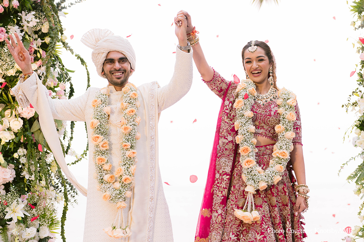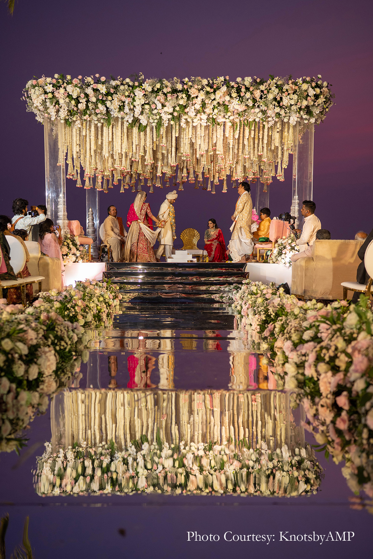 A beachside wedding mandap adorned with tropical foliage and delicate pastel blooms paved the way for picture-perfect moments at this couple’s destination wedding in Goa.