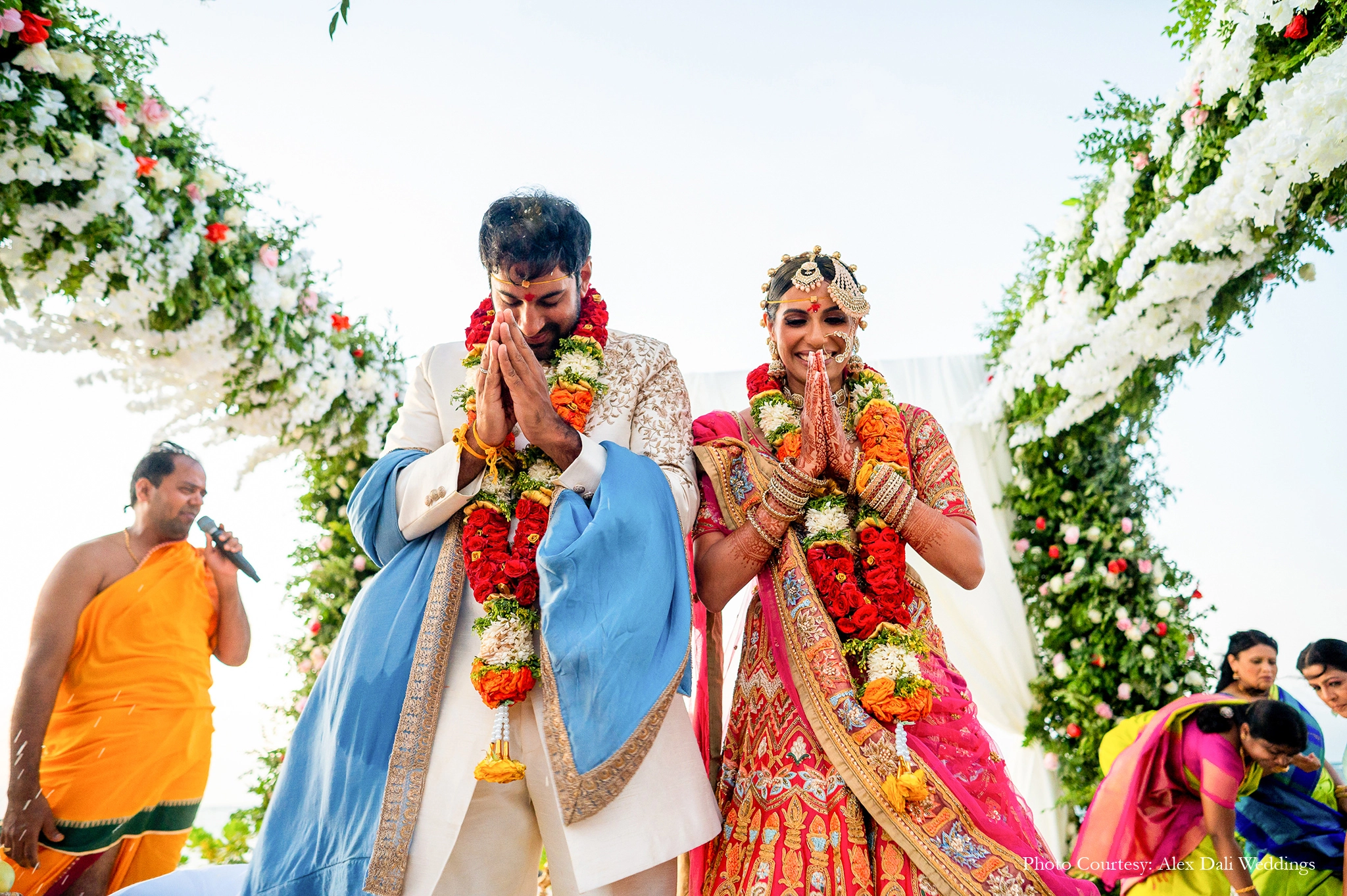 Set against the azure seas, the wedding ceremony painted a colorful picture. Flanked by elegant white seating, the floral aisle led to the stunning geometric mandap festooned with flowers, foliage, and billowing white drapes, while statues of deities and other brass ornaments added a touch of tradition to the decor. Baskets of sunglasses, parasols, and coconut water were arranged to keep the guests cool and comfortable through the beach ceremony. The groom flaunted a striking combination of cream and blue, aptly matching the ambiance, while the bride embraced a confluence of colors and textures for a show-stopping bridal look.