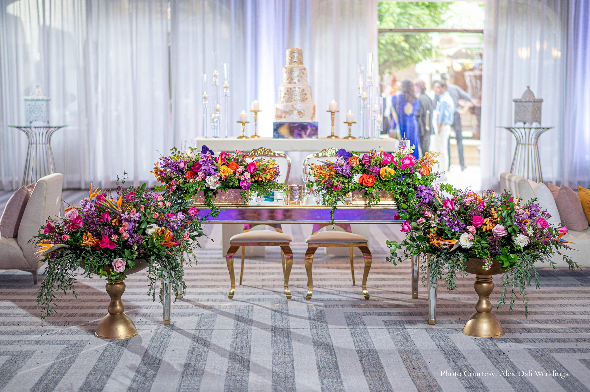 The festivities culminated in a vibrant Cocktail function that blended the avant-garde with modern elegance for a unique celebration. The palette of white and gold that covered everything from the decor to the cake was intersected with whimsical splashes of color, as flowers in every shade of the rainbow graced every table. At the center of the hall lay the dance floor, a vibrant mandala of pink, orange, and violet that tied the room together with a beautiful nod to their Indian culture.