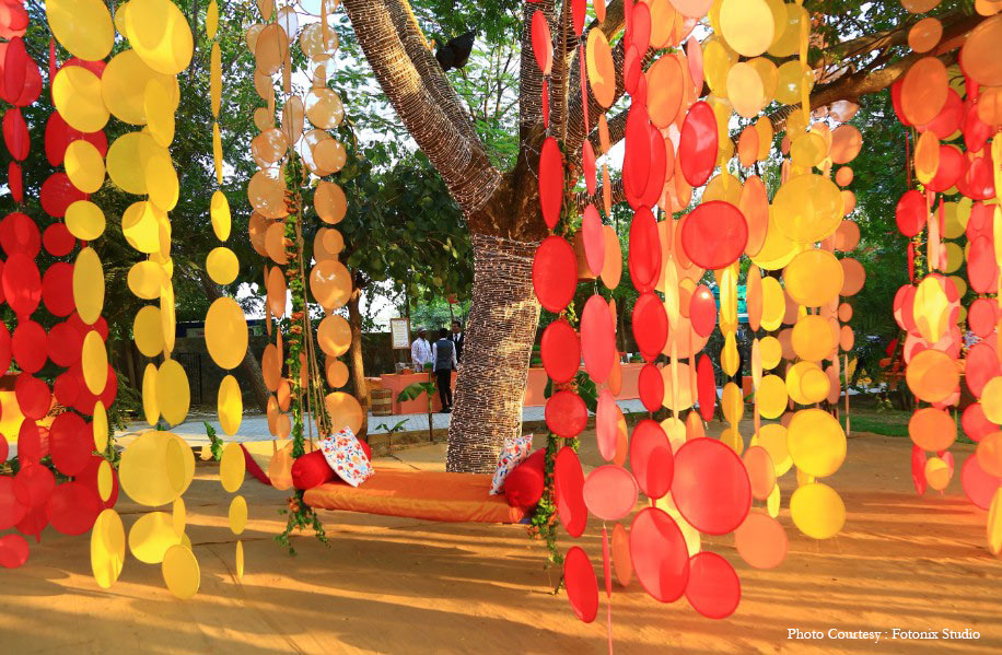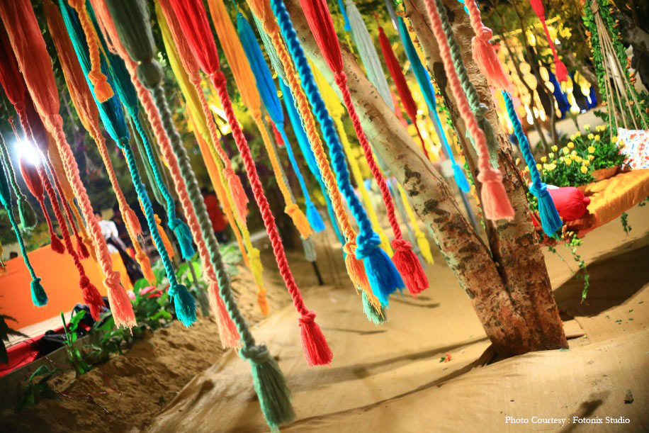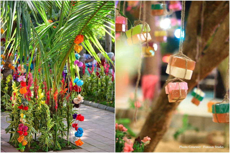 “We wanted this function to be colorful, fun and interactive, more than anything else! We used multiple circular frames and covered them in cloth – which was our take on tassels. We created customized table runners and cushions especially, hand-painted walkways, and also created a soap tree which was inspired by our travels which doubled up as a takeaway cover for our guests. We even had cross stitch roses on an existing grid – completing each one took us six hours!”