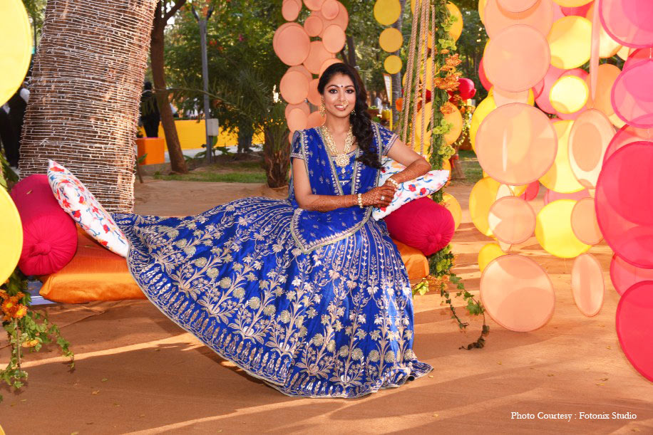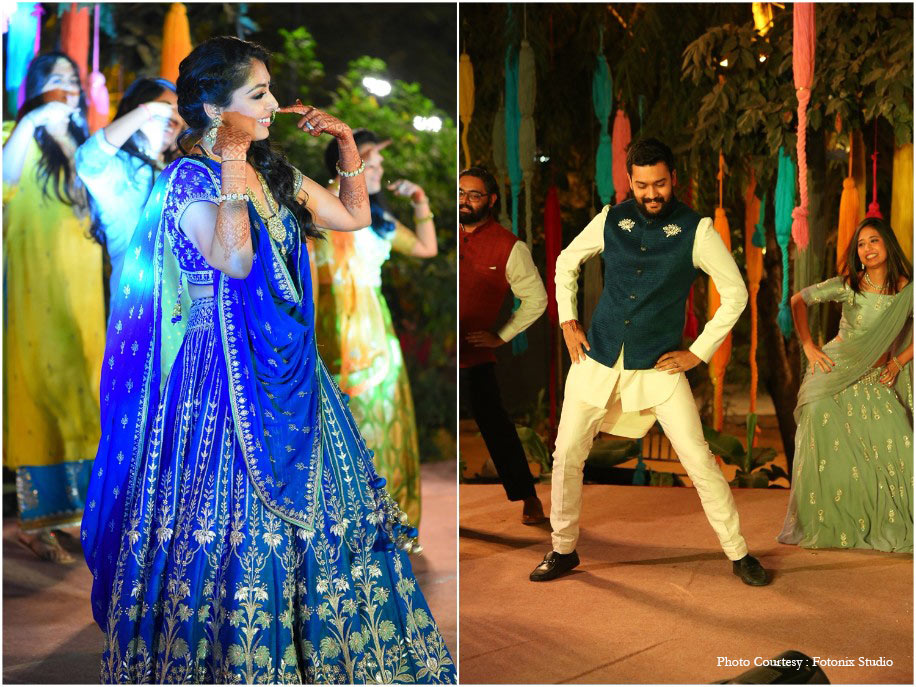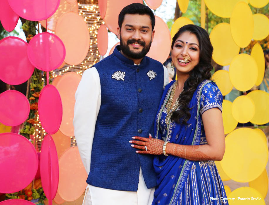 “In my mehndi design, instead of having Hrushabh’s names, I decided to incorporate an Adidas logo because he loves sneakers so much! In fact, to show his love for those shoes my bridesmaids and I even put up a small surprise dance performance for him. We danced on ‘Deewana Hai Dekho’ wearing sneakers. A friend of ours who played his character paid no attention to us when we were dancing, but the moment we lifted our lehengas to show him our shoes, he pretended to suddenly be very interest. The dance was choreographed on a mashup of ‘Chaiyya Chaiyya’ and ‘Don’t Stop’ since I love Bollywood and Hrushabh is a fan of Michael Jackson. For this function, I wore a blue lehenga by Anita Dongre, and Hrushabh opted for a white kurta with a blue bandi jacket by Kunal Rawal.”