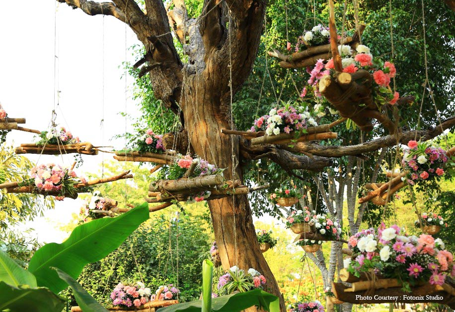 “Each Chiavari chair had a peach and white ombre fabric and was decorated with a bunch of baby’s breaths. From the trees hung golden cane baskets and small trays made of logs both filled with flowers. Flamingo models were installed by the lotus pond. Guests were given rose petals to shower on us during the pheras, and the petals were painted golden. We also had a headband made with baby’s breath for our dearest horse!”