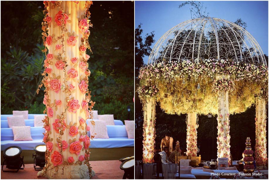 “Our wedding was designed to be very elegant. Peach, pink, white and gold were the colors used in the decor. We optimized the natural beauty of our garden and once again, planted a lot of pink poinsettias, wheat, and white petunias to avoid flower wastage. The mandap was a rather dreamy one with baby’s breaths, and eucalyptus stems painted gold, and freshly grown wheat on the inside. The pillars were decorated with plaster of Paris roses and leaves which were in line with the light color palette of the function.”
