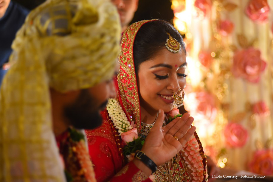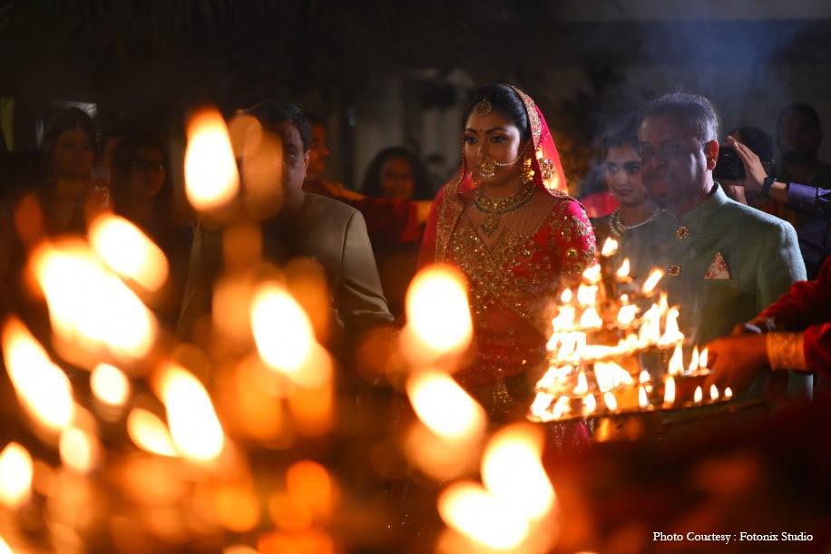 “I entered the venue with lots of large diyas like those used at the Benaras ghats during the evening ‘aarti’ (prayer ritual) around me. We were a Sabyasachi couple on our wedding day – I wore a red lehenga while Hrushabh opted for a sherwani in the same color.”