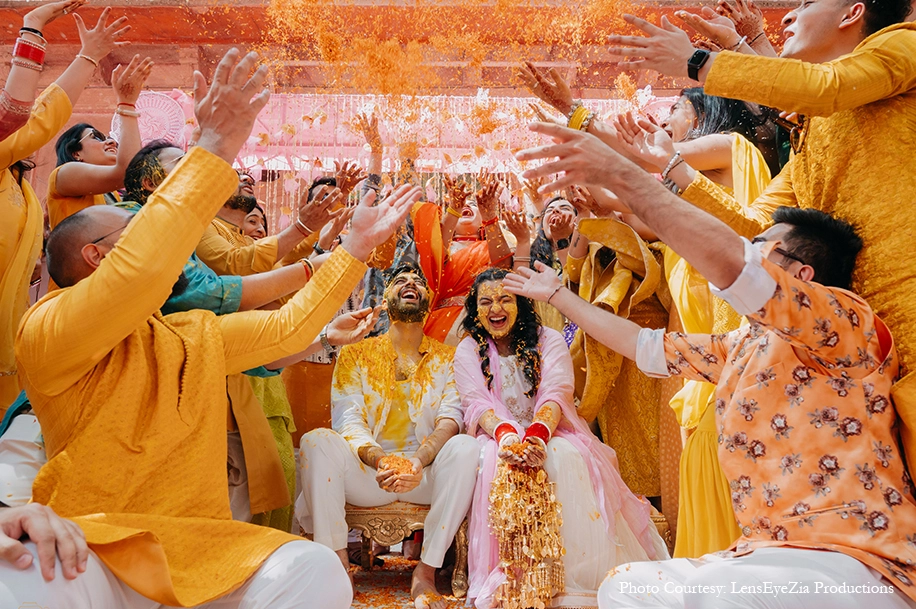 The bride shares, “Instead of opting for the usual yellow hues we went for a pink and white themed haldi which rejuvenated the senses. It was such a playful function under the bright sunshine. We had the time of our lives!”
