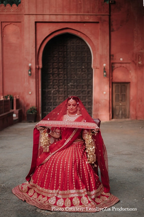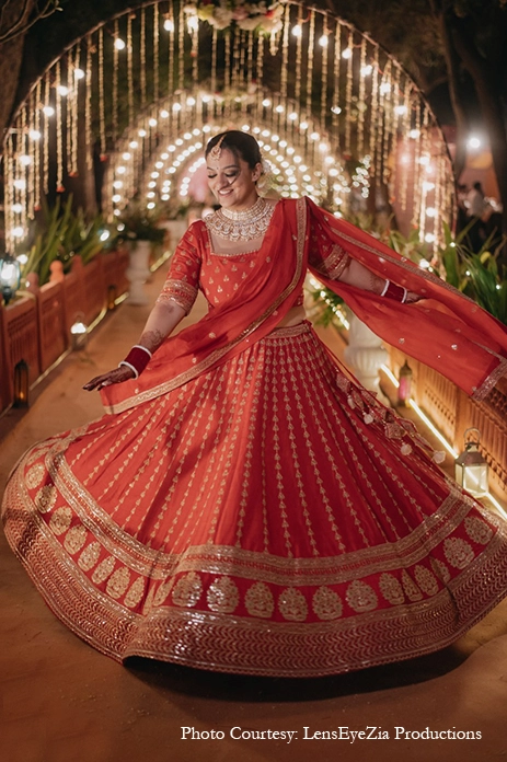 Mallika shares, “I love everything vintage and with character so I knew for sure that I wanted to dress up as a royal traditional bride. A minimal red and gold lehenga was an obvious choice for me and the ensemble was designed from scratch by my mother and me. The theme of our wedding was royal and heritage.” She adds, “Growing up, I always dreamed of a palace wedding and Gajner Palace was the perfect fit. We both love being in quiet surroundings and this place offered us just that! We both wanted an intimate wedding, with just our close family and friends where we escape away from the city noise to celebrate our love. Gajner palace was our oasis for those two days.”