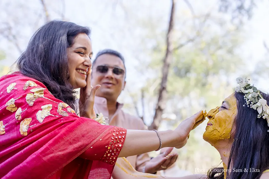 Also, knowing how important it is to have a skilled wedding photographer on board, the couple roped in Sam & Ekta who impressed them with their skills. Gushing about the photography team, the bride shares, “When it comes to wedding photography, I don’t think it gets any better than Sam and Ekta. We first met them at my brother’s wedding and they came across as very sweet and friendly individuals apart from being incredibly talented professionals. So the one thing that we were very sure of, even before we started planning our wedding was that we wanted Sam and Ekta to document our wedding. Their photography has the power to enable us to relive the small beautiful moments that would otherwise be forgotten, and that’s the best thing that you could hold onto long after your wedding. We had an amazing experience with them, right from the pre-wedding shoot at the farmhouse until the day of the wedding. They were always present at the right place and the right time, to capture all the important moments! And apart from making us feel extremely comfortable, they made the experience really exciting and fun for our family and friends too.”