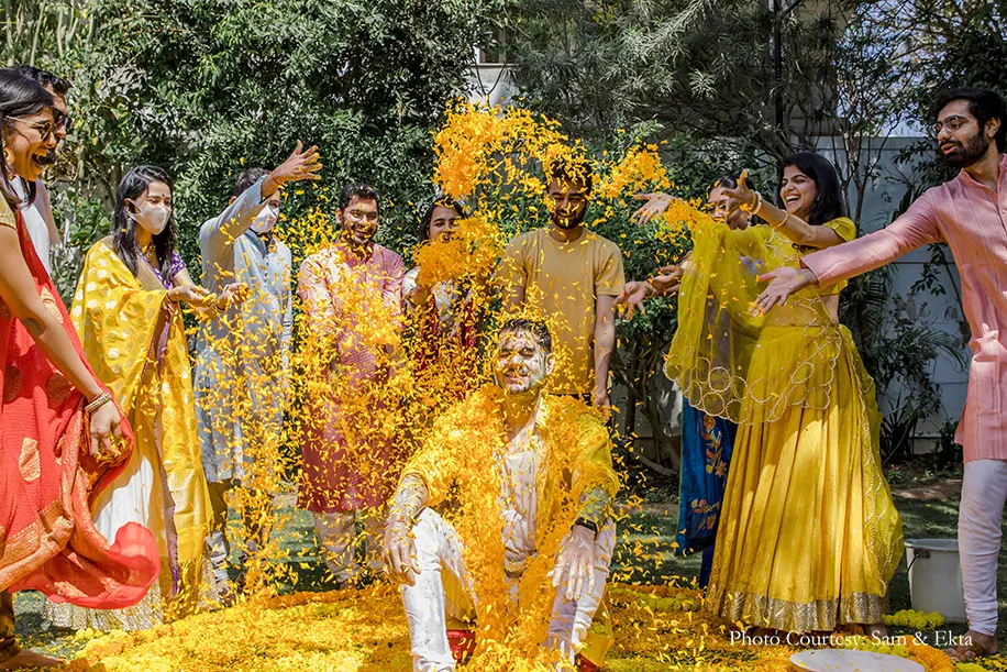 The bride says, “Abhishek’s Haldi was at home where he was smeared with haldi from head to toe by his family amidst a whole lot of fun and laughter. Meanwhile, my haldi was at the farmhouse where the decor was in sync with the rustic and traditional vibe of the farmhouse. Terracotta pots along with jute and bamboo were accentuated with baskets filled with marigold flowers that reflected the ‘phoolon ki holi’ theme. The backdrop was a beautiful marigold ombre setup that creatively cascaded from orange to light yellow marigolds.”