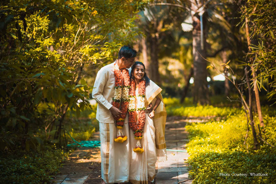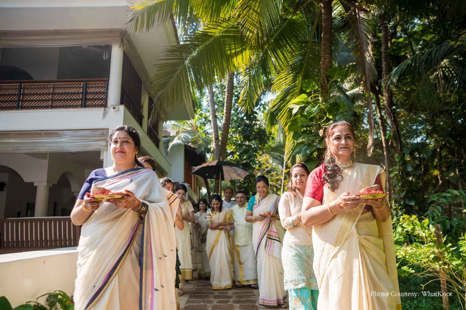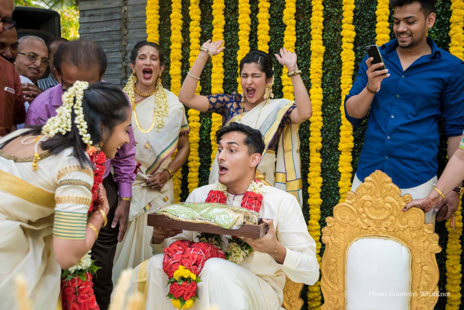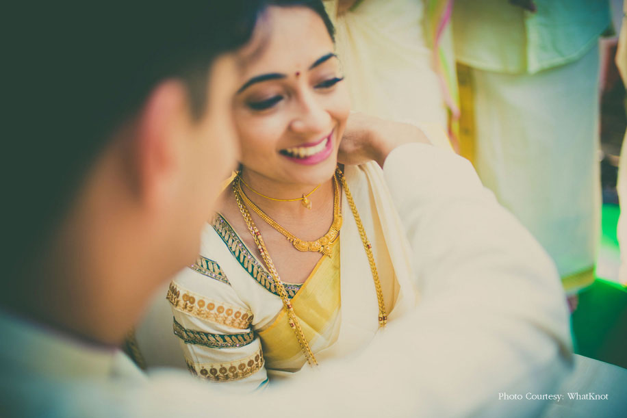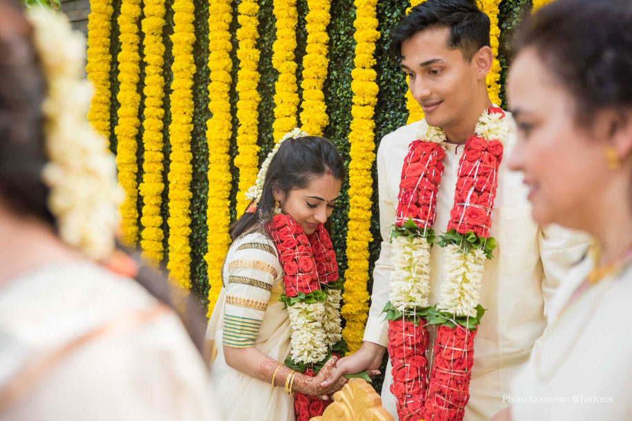 “The next morning we had our ‘Kalyanam’ (Malayali wedding ceremony), where all the attendees were dressed in white. The event took place in the small Zen garden in the backyard. The decor was simple with just banana leaves, yellow marigolds, and coconuts. Although this was the simplest event, with minimal decor, it was certainly my favorite. Pranay loved that a part of the ceremony where I had to touch his feet! We served a traditional ‘sadhya’ (Malayalam feast) for our lunch in the living room, on banana leaves with no cutlery. We all wore traditional Malayali clothes which my mother-in-law arranged from Kasavukada. My saree had deers on the border, which was an ode to our home in Richmond, near a park with lots of deers. All the jewellery I wore were heirloom pieces. My necklace was from my great-grandmother, bangles from my grandmother and earrings from my mother. My hair was simply straightened and pinned half up, and I just applied a little eyeliner on my lids.”