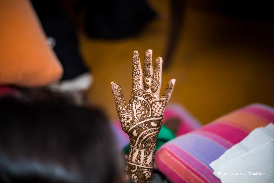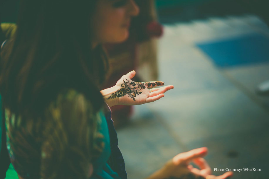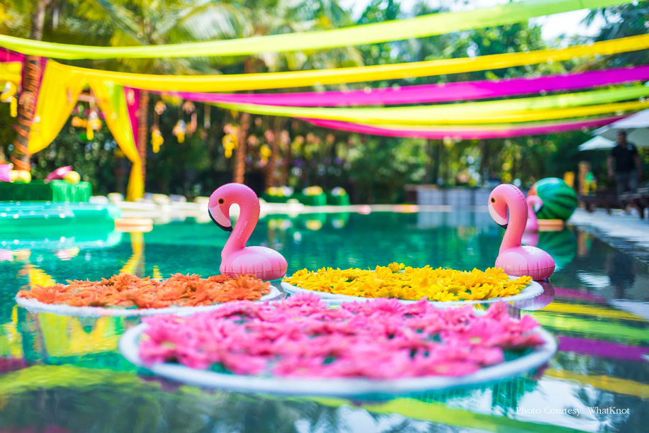 “Our first event was a poolside mehndi function, with colorful drapes, decorative hanging accents, and marigold blooms. We served chaat and beer and had a traditional Punjabi folk singer singing mehndi songs. As each family member entered, the folk singer dedicated a song to them and got everyone dancing.”