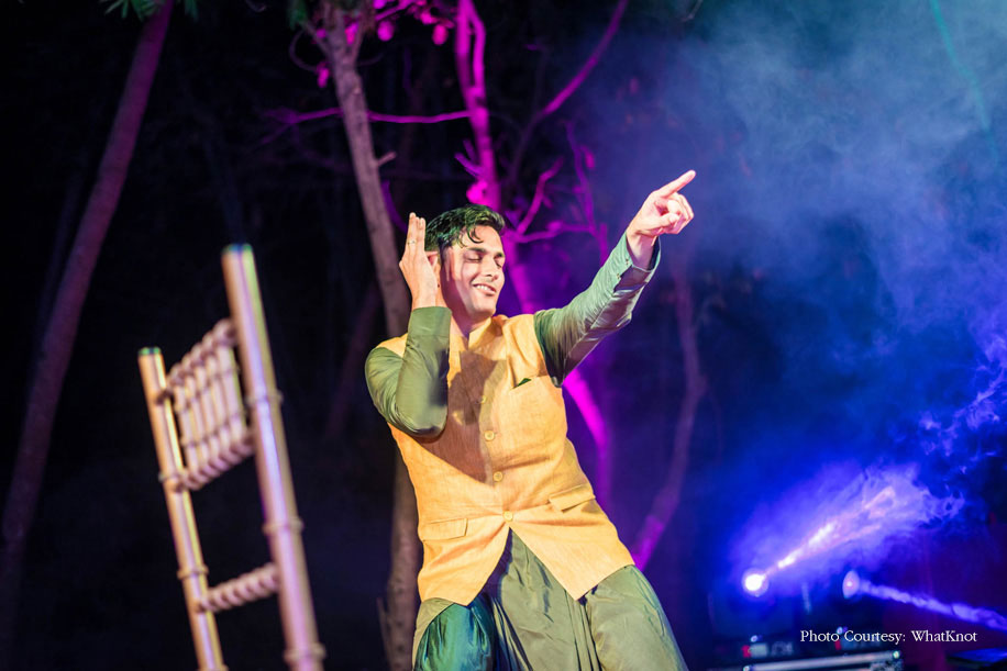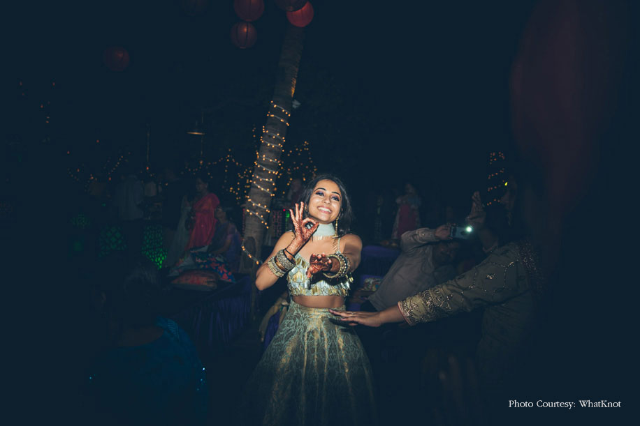 “Our sangeet took place the same evening for which we moved to the back garden near the pool. Our closest friends put together a very personal script and dances for us, and even included our grandmothers in the performances! Later the dance floor opened up with plenty of cocktails going around. The smoke machine and lighting created the perfect atmosphere. I wore a Payal Singhal lehenga for this function. The blouse with its tassels packed the right amount of fun. I accessorized it with earrings from Minerali and bangles from Sabyasachi. Overall, I minimized the use of gold at the wedding. I did my hair in modern waves, and for my makeup, I created purple smokey eyes with a nude lip. Pranay wore an navy kurta and dhoti outfit from Ensemble along with a yellow bandi jacket.”