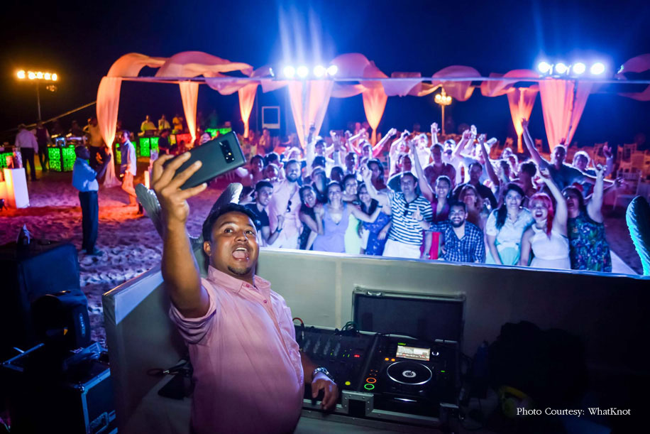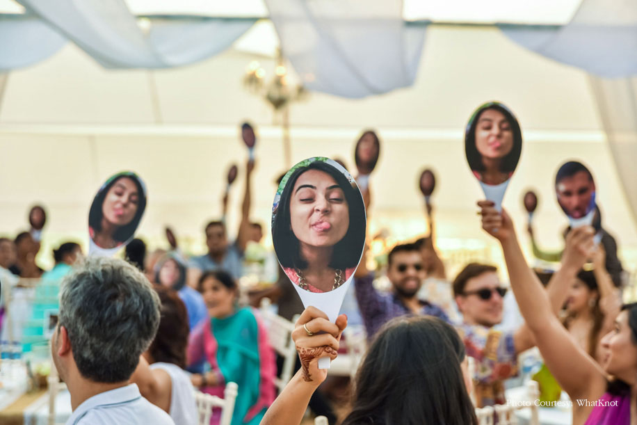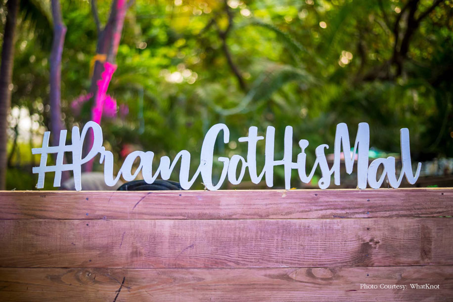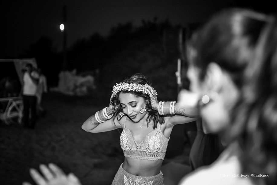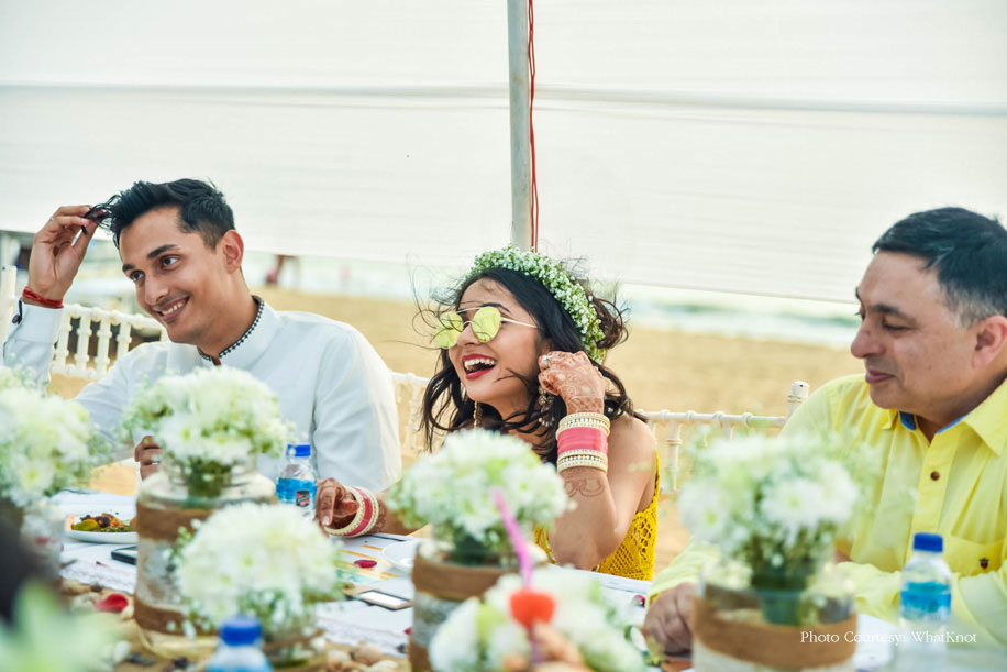 “The next morning we had a beach reception which was hosted outside a beach hut. We had the seating planned where all the tables were named after meaningful places from our childhood. The setup itself was all white, with drapes, and table centerpieces and pictures of us. We had games and speeches, and the highlight of the event was a game where our guests voted for “Who is most likely to” using paddle boards with our faces. The dance floor opened after sunset, and the music entertained guests till late in the evening. The shots bar was a busy spot through the night! I wore a crochet top and skirt from Arpita Mehta with earrings from Anthropologie. My makeup included a bronze finish and bold red lips. My hair was styled in beach waves, and I accessorized with a floral crown. Pranay wore a simple white shirt from Shantanu and Nikhil, with a pair of printed trousers.”