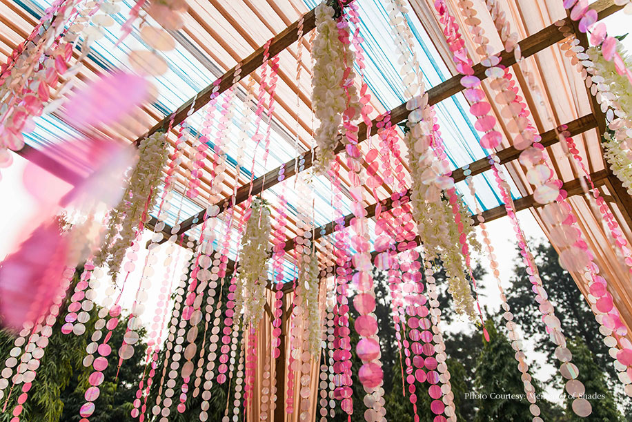 After this, the party moved to the wedding venue. The decor there was reminiscent of a vintage backyard garden. We mixed solid color drapes with those that had floral prints. Additionally, a lot of little details such as flowers, vintage furniture, origami butterflies, paper lanterns, floral vinyl for the dance floor and so on were added by Ridhi to elevate the decor and the mood of the setup. The entry points for the guests as well as the bride were bamboo frames draped in a floral fabric. We kept the decor minimum as we wanted to maintain the original charm of this lovely garden. Ridhi understood my brief perfectly and did a fabulous job with the decorations.”
