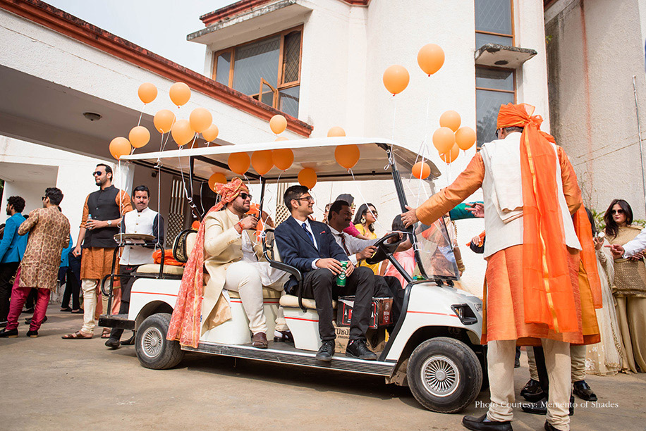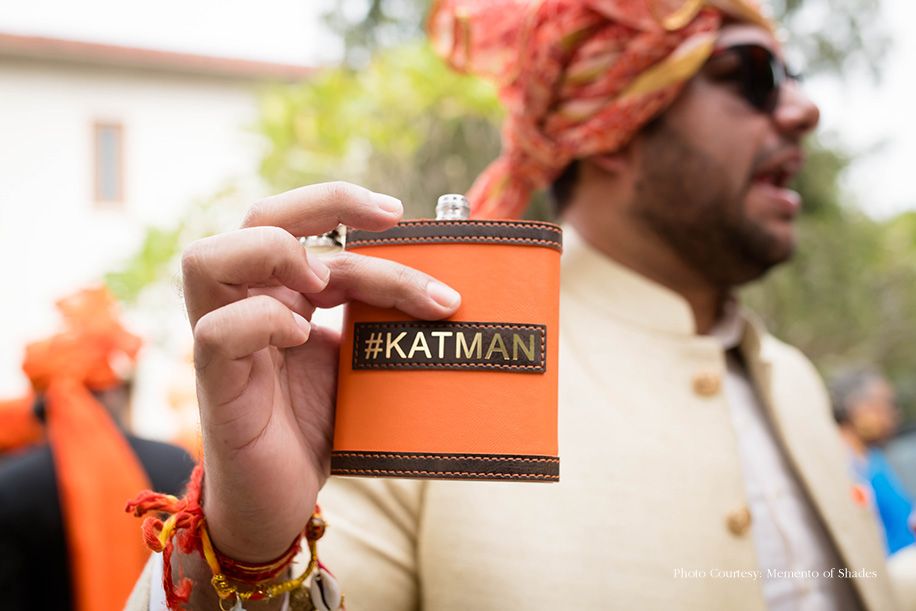 “Kartikeya’s favorite color is orange, and that was the prominent color in the baraat. There were orange balloons tied to the golf cart and distributed amongst the baraatis. Before the jaimala, the balloons were released at the same time to further the spirit of celebration. We had arranged for special hip flasks that featured our wedding hashtag #KatMan. These were courtesy Baroque which is a brand which is owned by Kartikeya’s cousin, Sumalini Khullar.”