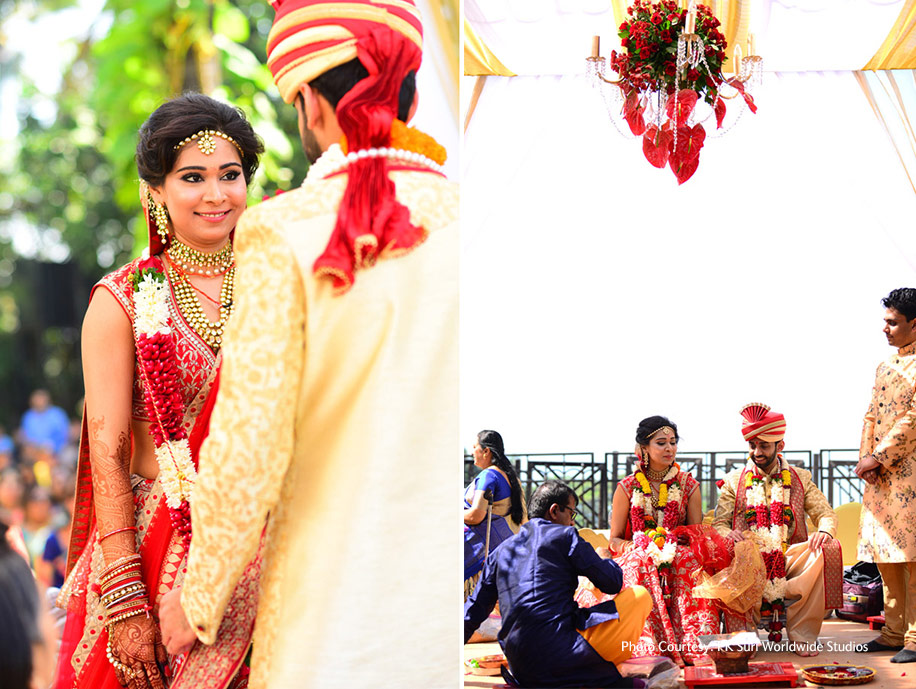“I wanted an outdoors wedding with a regal theme so opted for floral decorationsin tones of red to complement the green palm trees at the Taj Lands End poolside lawns.” Manisha chose a bright red lehenga from Anita Dongre with embroidery details in gold. Her bridal look was complete with a layered kundan necklace, a statement choker, maang tikka and gorgeous earrings.