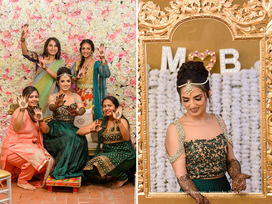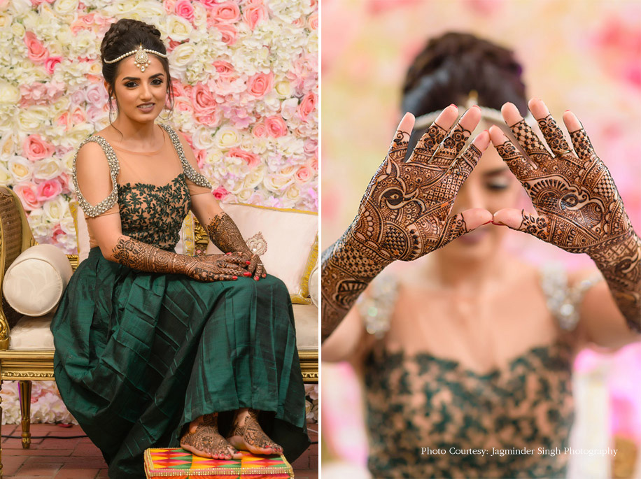 Manpreet’s mehndi was an all-girls night. The bride says, “We had lots of henna, food and dholki fun! I chose a pastel floral theme with a pop of emerald. There was a wall of flowers as a backdrop with birdcages and pearls. There was an emerald green gaddi area with pastel peach cushions. A dessert table was set up which included chocolate strawberry tarts, dessert cups, knafeh and a henna-inspired cake. We also had a jalebi stand and personalized cute jam and honey jars as favors. Sitalisa Dasi was my henna artist, and she did an amazing job personalizing my henna. On my left arm she drew a stethoscope with a love heart and Bhavneet’s initials, as he is a doctor. On the right arm, I asked her to design a cupcake, as I run a cake business. I’d always wanted to personalize my mehndi and thought this was very special.”