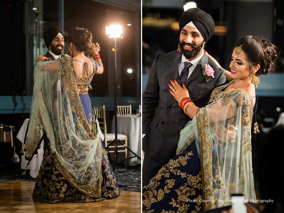 The couple met as youngsters at the same Sunday Language School where they’d learn Punjabi, the bride says, “We knew of each other, but many years later we reconnected through Facebook and bumped into each other at social gatherings. We starting talking and getting to know each other and here we are!”