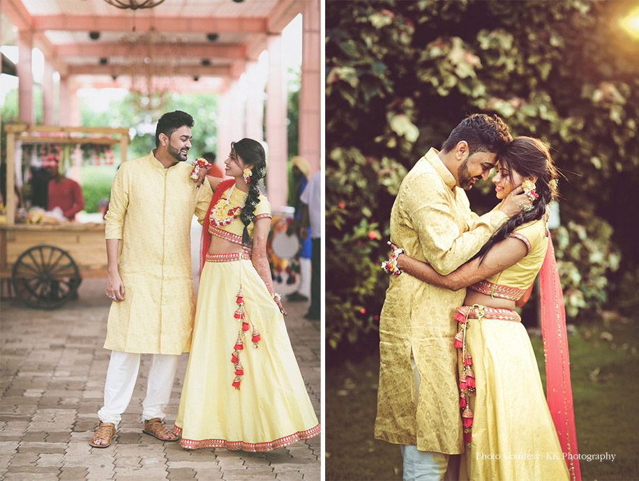 “You can’t do without the color yellow for a haldi ceremony! I paired my lehenga with delicate floral jewellery from Wraps And Pack, and Sidharth color coordinated with me by wearing yellow attire too. Our decor palette was all about red and yellow hues.”